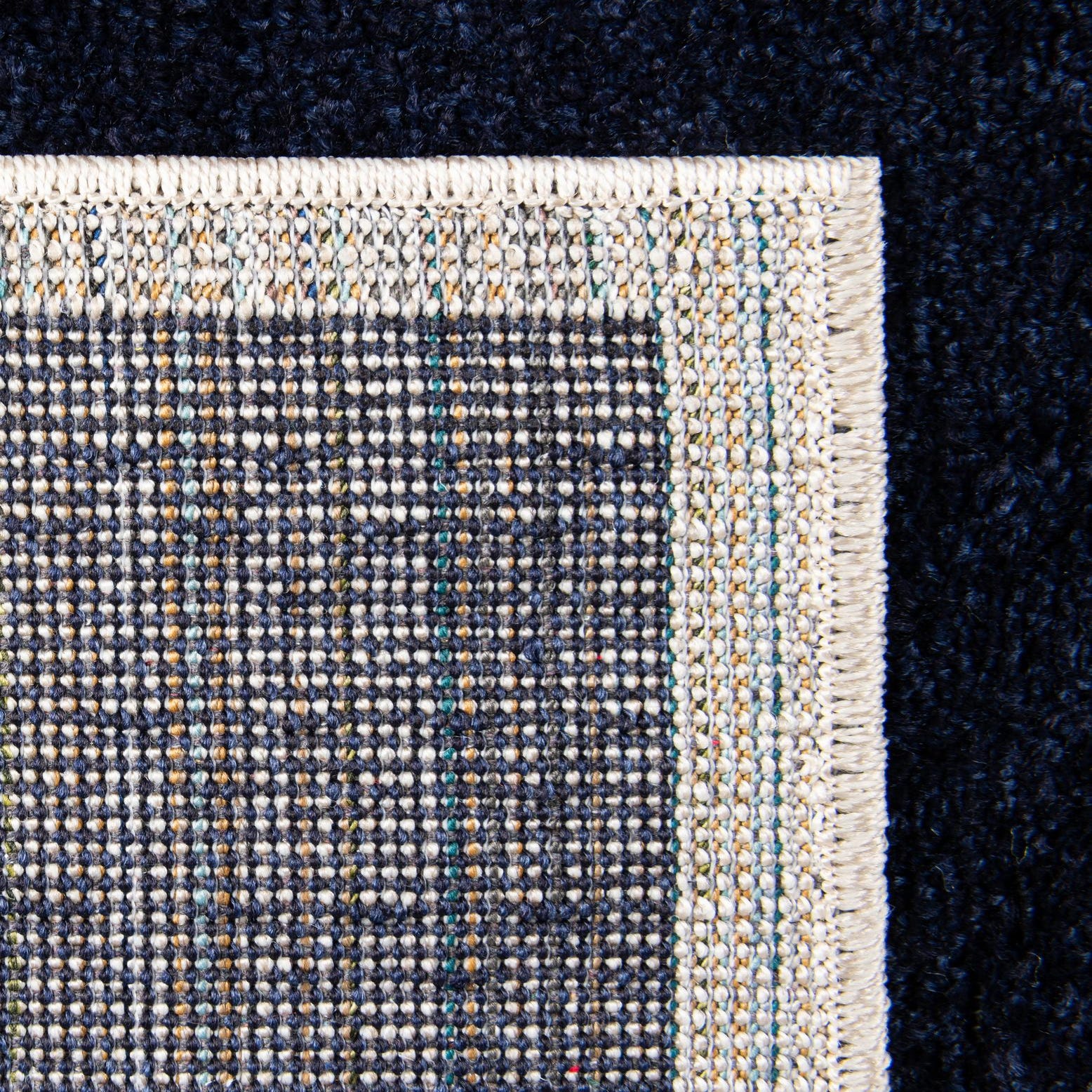 Primary color is Navy Blue. Colors in this rug include: Navy Blue, Beige.