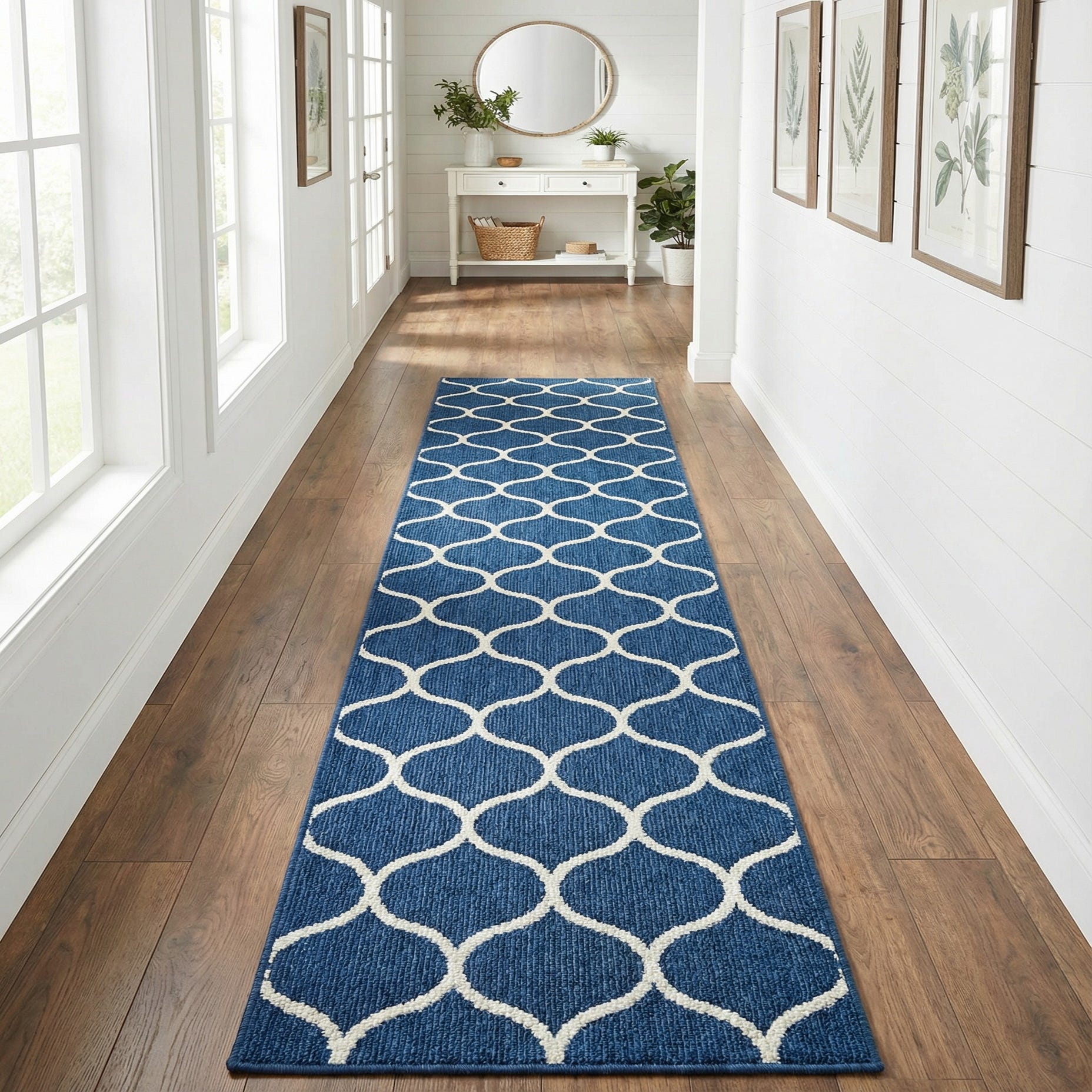 A classic trellis pattern in crisp ivory traces a repeating, Moroccan-inspired lattice across a deep navy ground. Machine-made from 100% polypropylene, the rug has a dense, plush pile that feels cushioned underfoot while the slightly raised ivory lines create a subtle tactile contrast against the smooth navy field. The color pairing of navy and ivory offers a clean, graphic look that holds up visually in both narrow and open spaces.