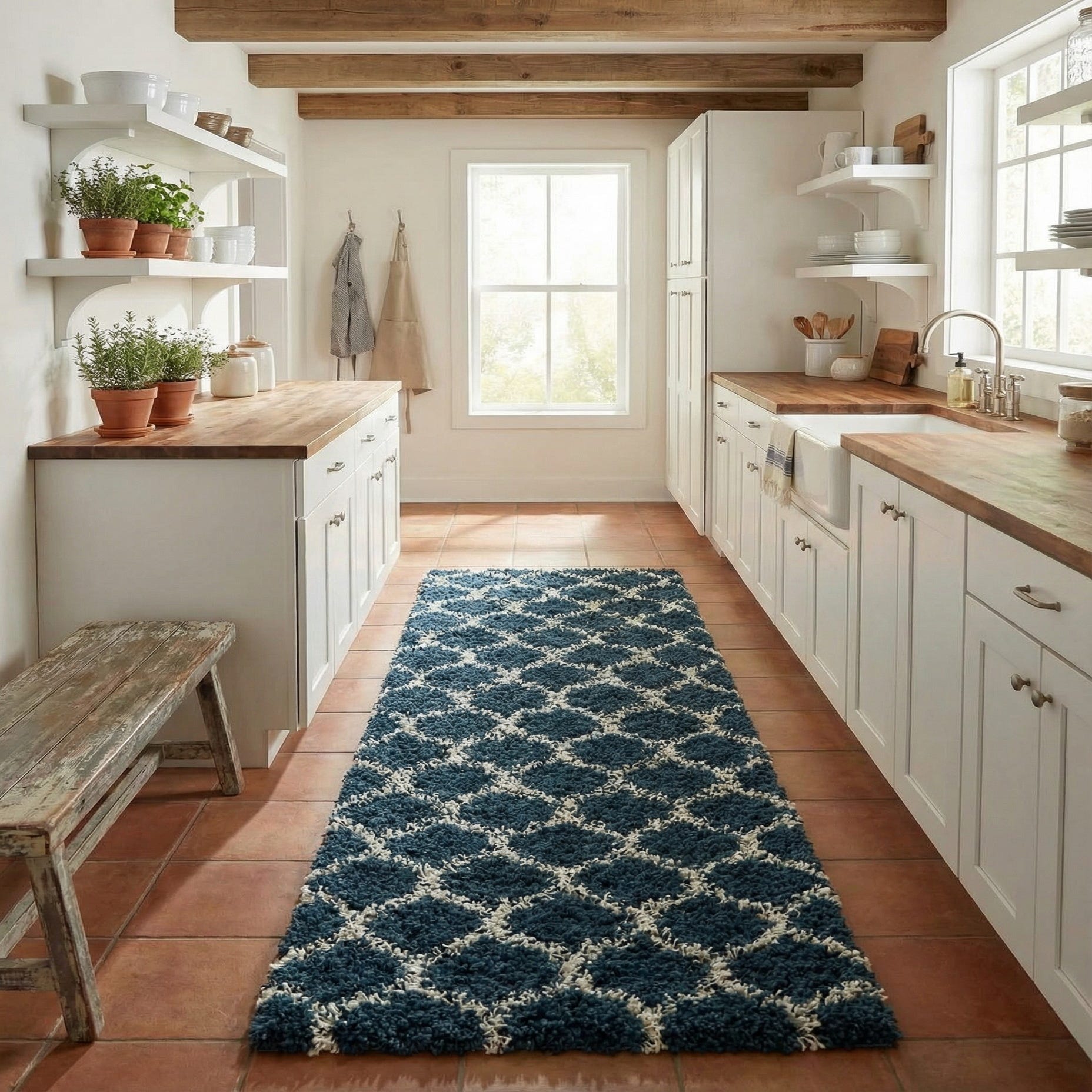 This piece works well in a hallway or narrow entry to anchor light walls and tie together navy accents. Pair it with white-painted trim and light oak floors for a coastal-inspired palette, or use it in contemporary and transitional schemes alongside chrome or brushed-nickel finishes and neutral upholstery for a layered, modern touch. It also makes a welcoming bedside runner, adding warmth and texture to a bedroom layout.