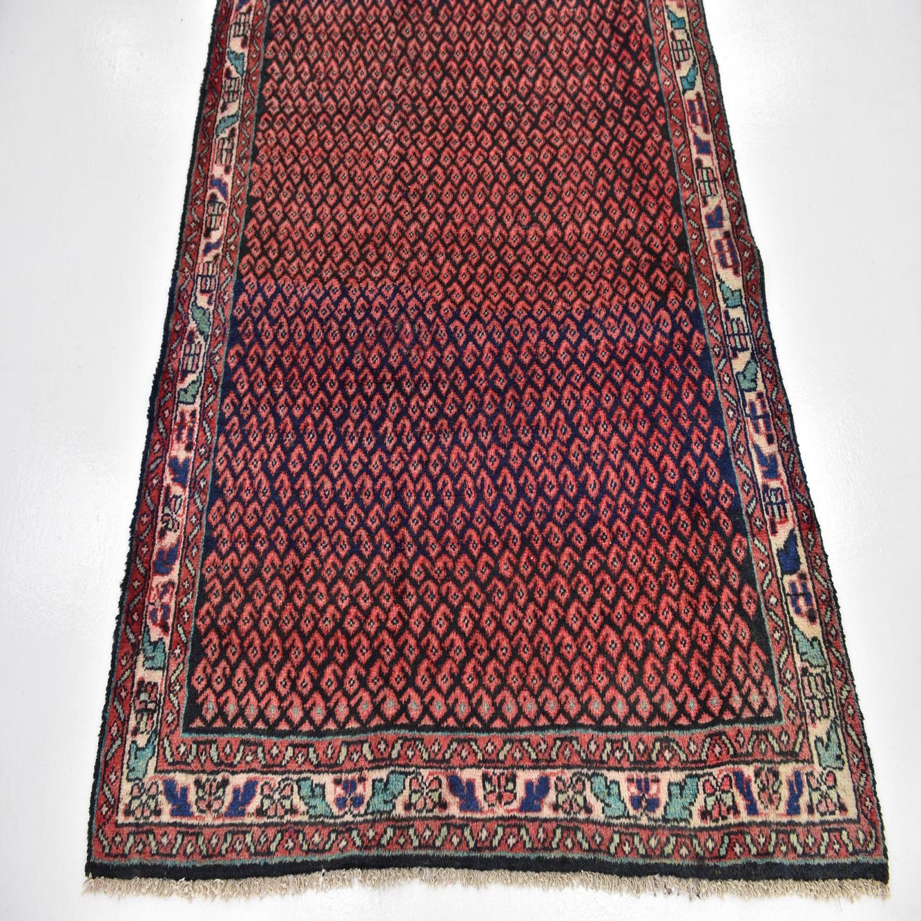A 10 ft runner rug in traditional Persian style, featuring a navy blue field with red tribal patterns and a multi-colored border, perfect for a hallway.