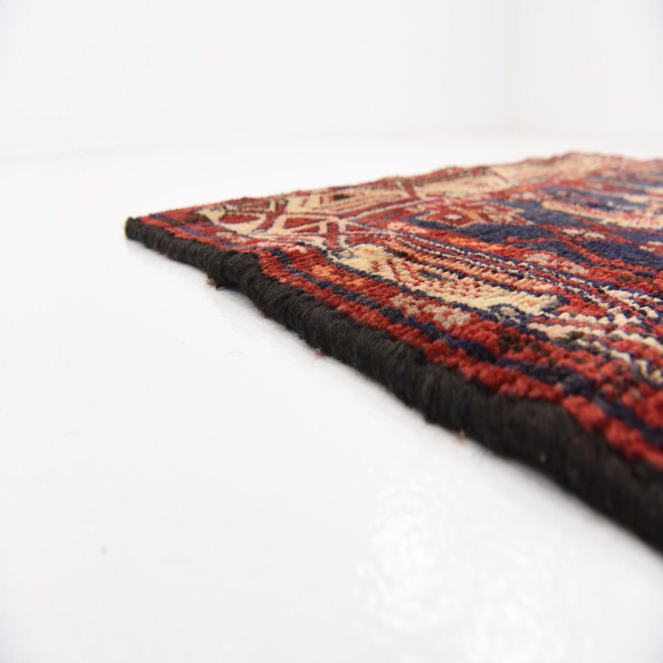 A 10 Ft Malayer runner rug featuring a deep navy blue field with intricate red and cream tribal patterns and a detailed border, perfect for a hallway.