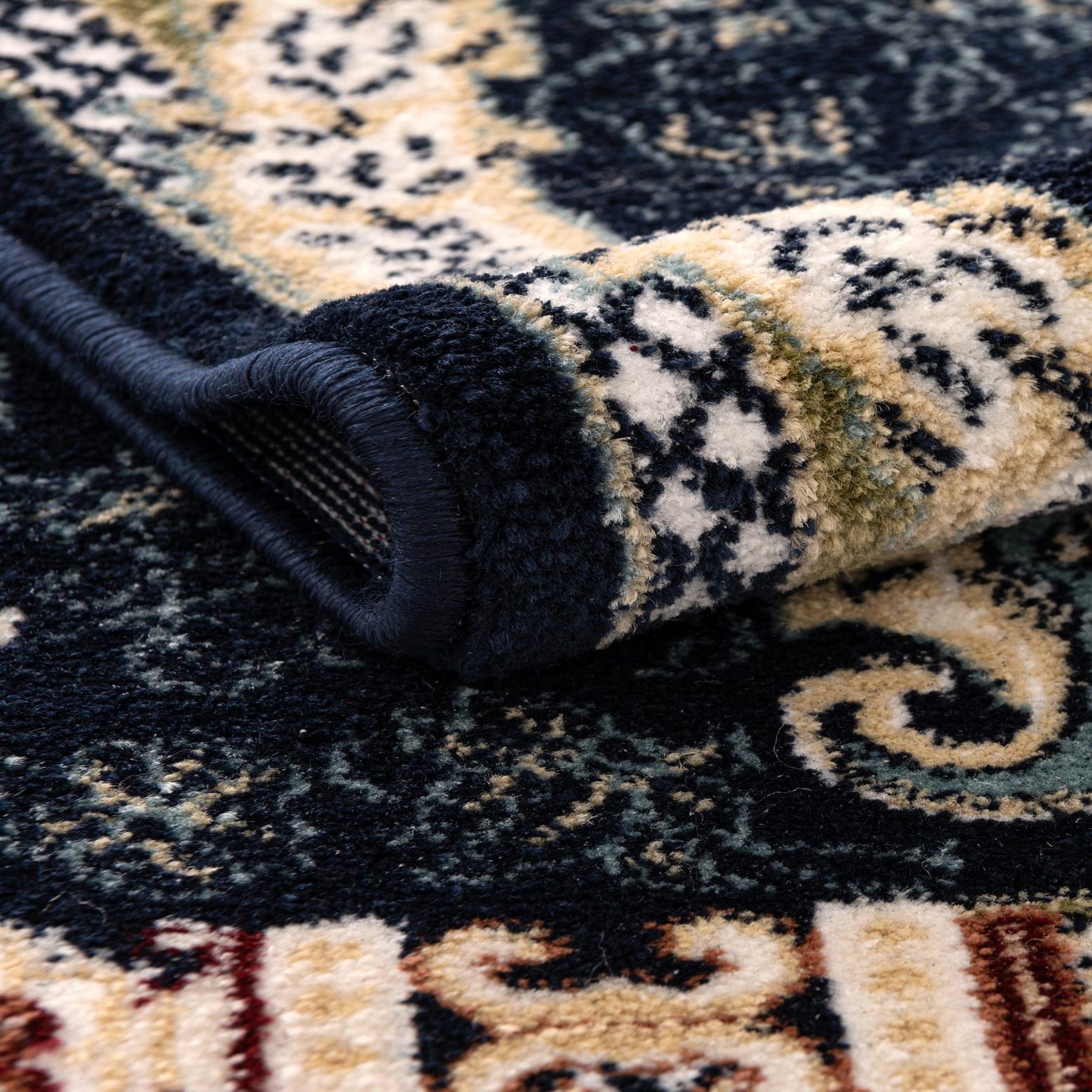 Primary color is Navy Blue. Colors in this rug include: Navy Blue, Blue, Burgundy, Cream, Green, Ivory, Plum Red, Tan.