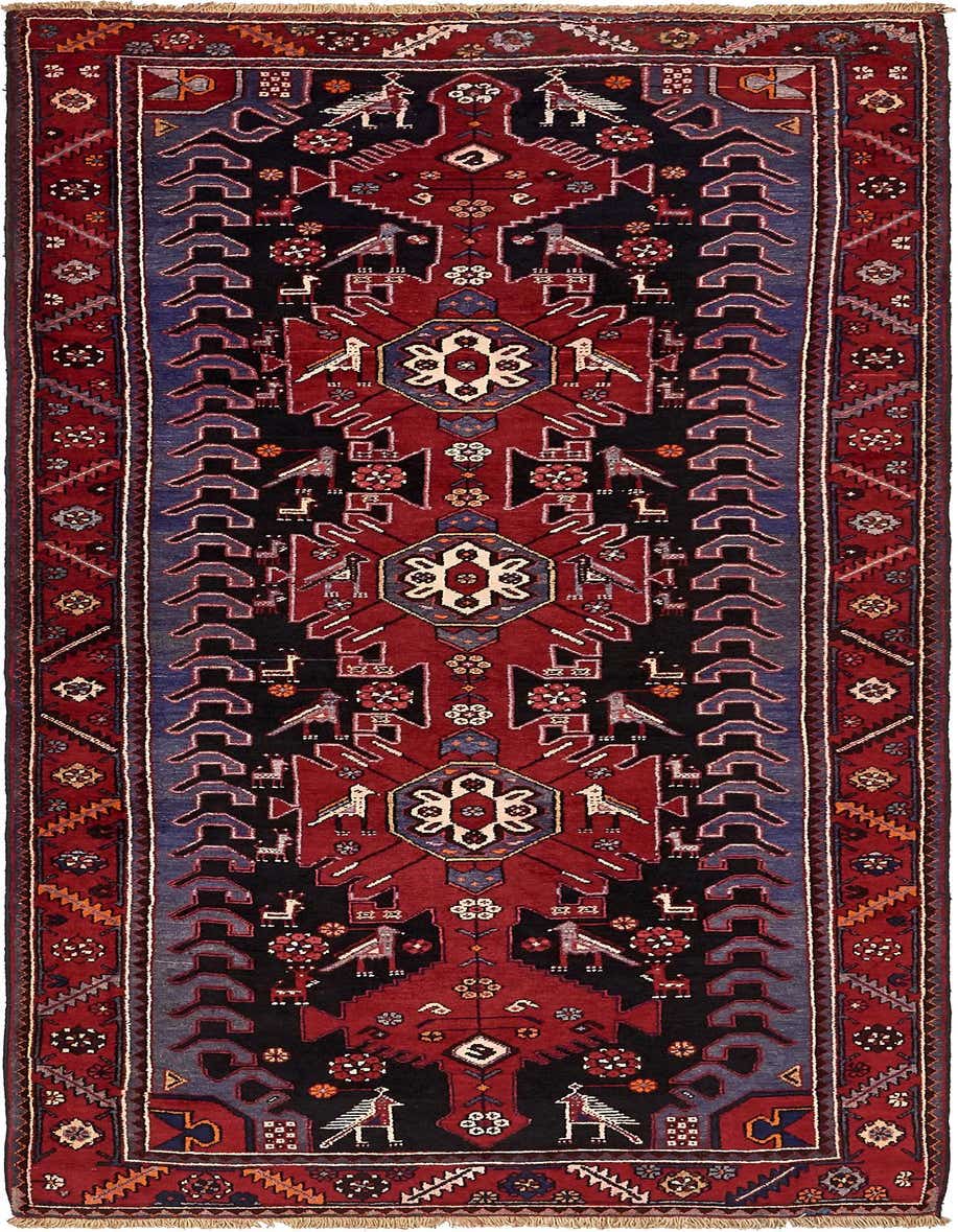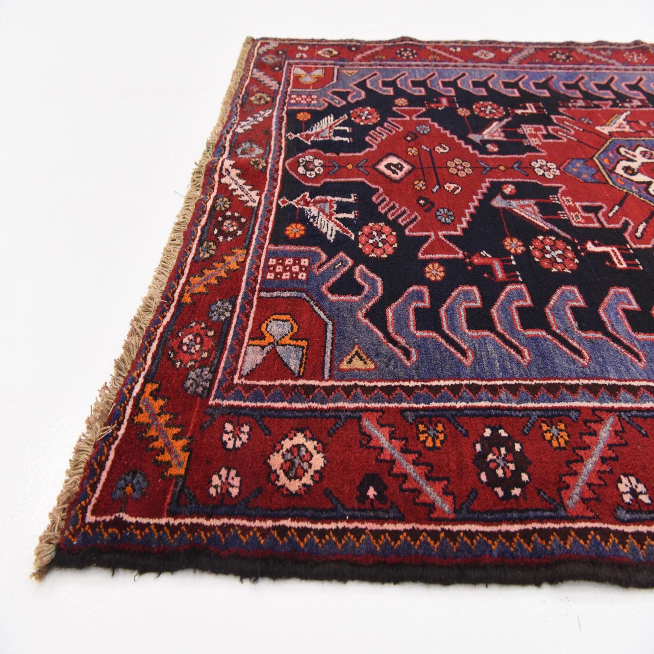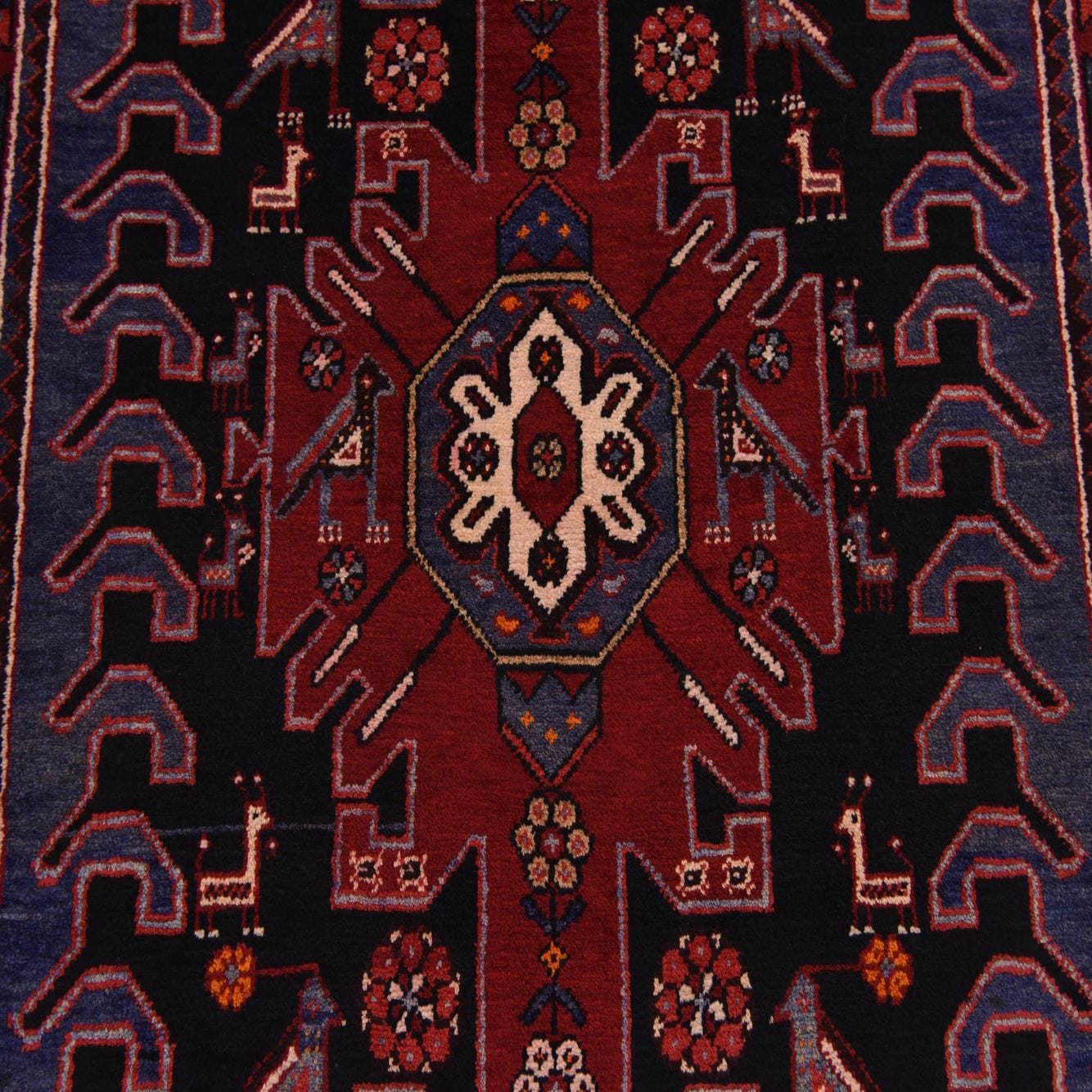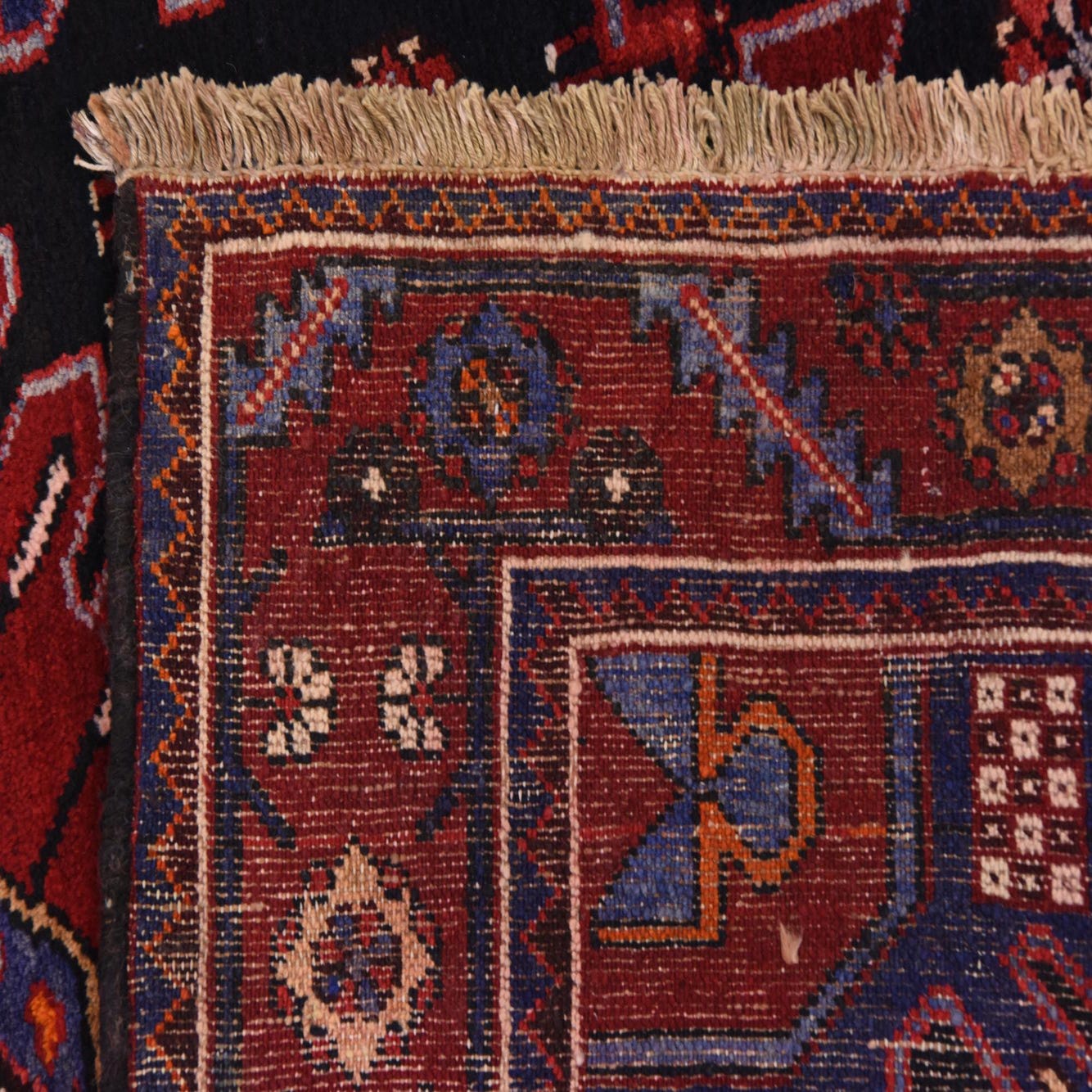 Primary color is Navy Blue. Colors in this rug include: Navy Blue, Blue, Olive, Red, Rust Red, Cream.