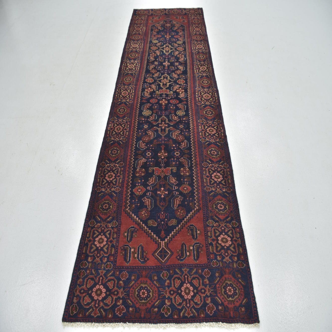 The Shahsavand collection runner is a hand-knotted piece crafted from 100% wool, presenting a plush and durable texture that adds a touch of warmth and comfort underfoot. Spanning 10 feet in length, this runner is adorned with a rich navy blue background that anchors a traditional pattern with a blend of colors including black, blue, ivory, olive, peach, green, and burgundy. Decorative elements are precisely laid out, creating a balanced visual harmony ideal for adding a sense of opulence and classic style to any hallway or long, narrow space.