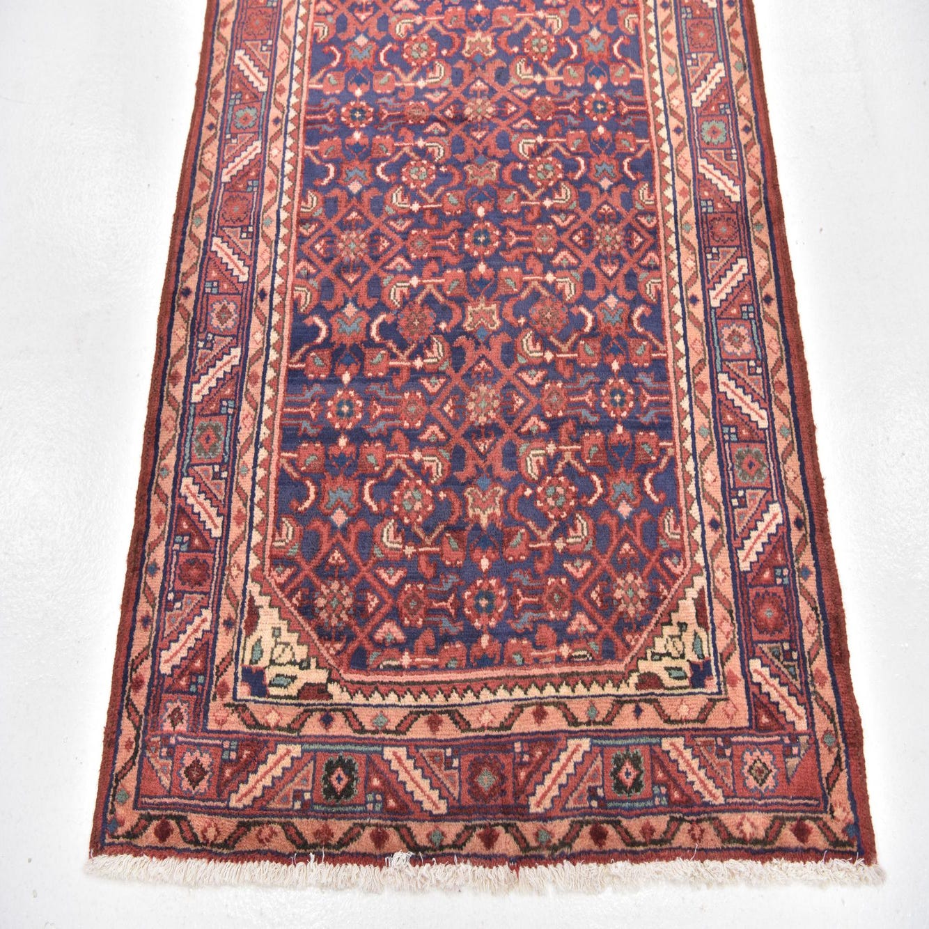 This runner's design draws inspiration from timeless Persian patterns, presenting a series of interconnected floral and geometric shapes that are meticulously arranged to create a harmonious and sophisticated visual. The balanced distribution of colors ensures that the rug maintains a captivating presence without overwhelming a space.
