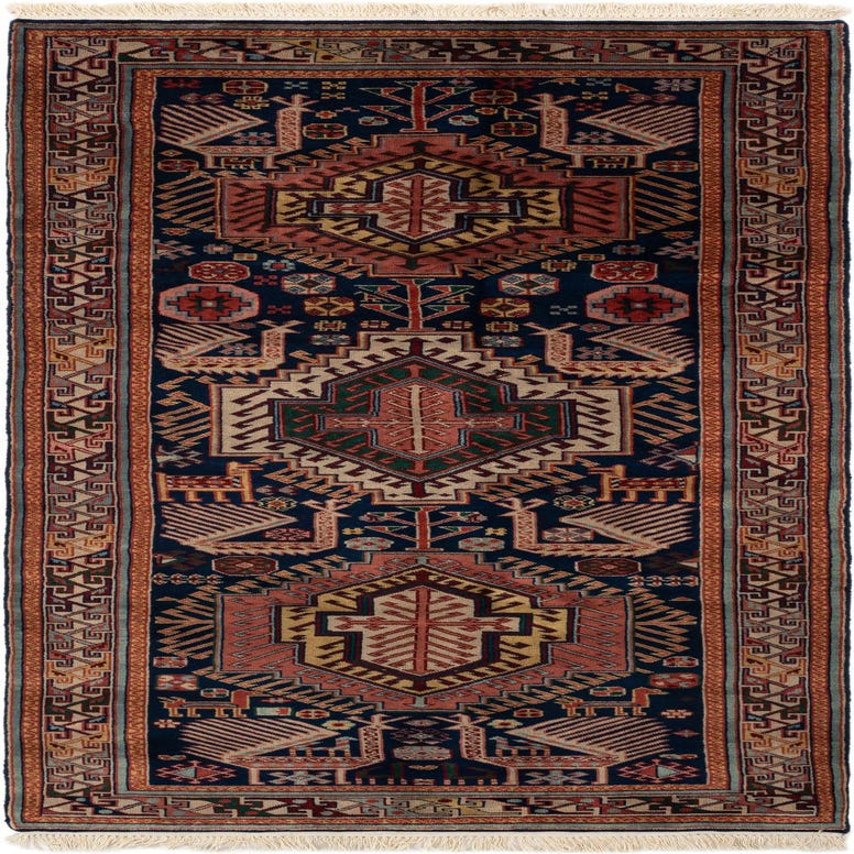 Primary color is Navy Blue. Colors in this rug include: Navy Blue, Blue, Brown, Green, Ivory, Yellow, Pink.
