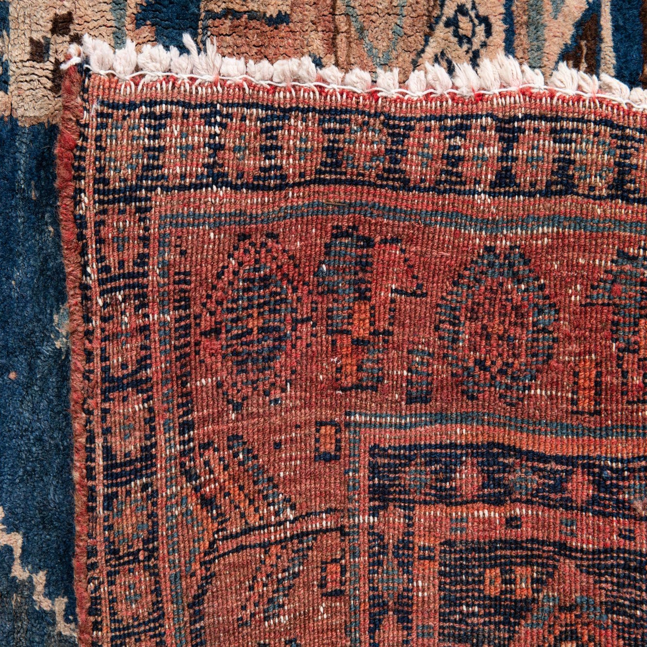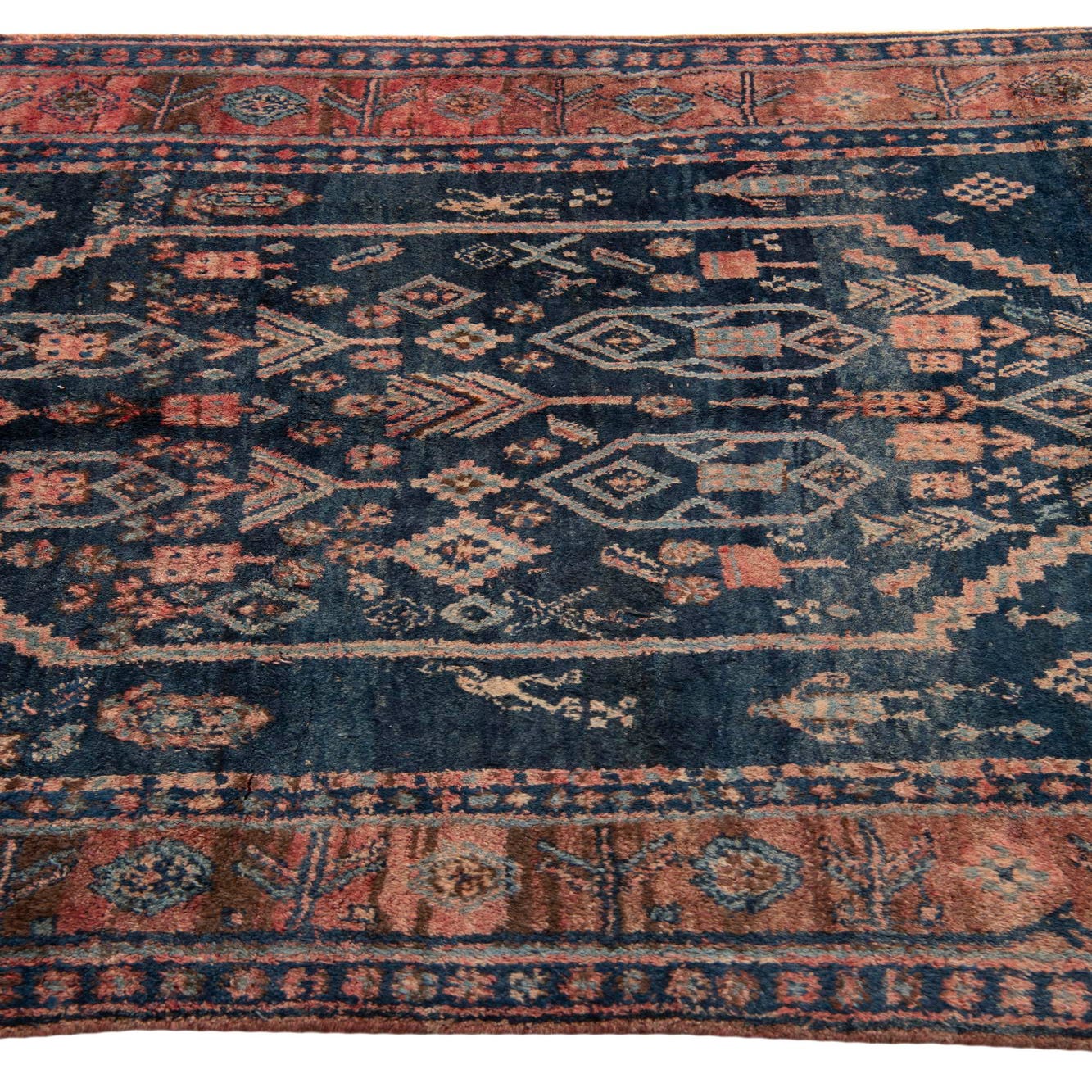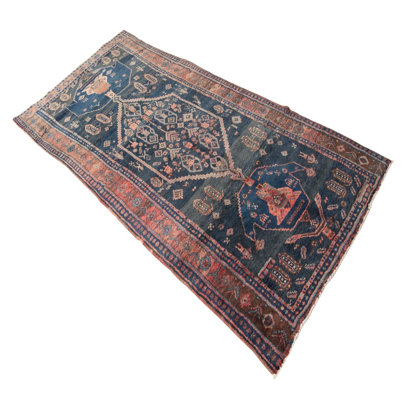 A 10 ft runner rug in deep blues with a central ornate Persian medallion and intricate coral, peach, and light blue traditional patterns, framed by a detailed border.