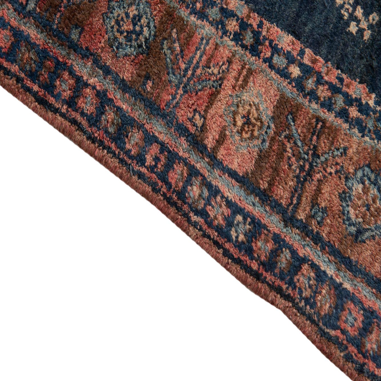 The Ultra Vintage collection presents a meticulously hand-knotted 10 Ft Runner, crafted from 100% wool, offering both durability and a soft texture. Dominated by a rich navy blue background, the rug's visual narrative unfolds through traditional patterns embellished in hues of brown and rust red. The intricate design features geometric and botanical motifs in a symmetrical arrangement, anchored by a central medallion.