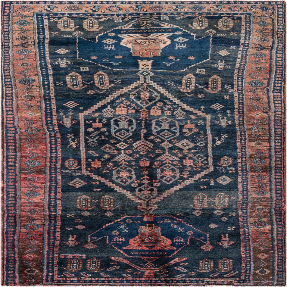 Primary color is Navy Blue. Colors in this rug include: Navy Blue, Brown, Rust Red.