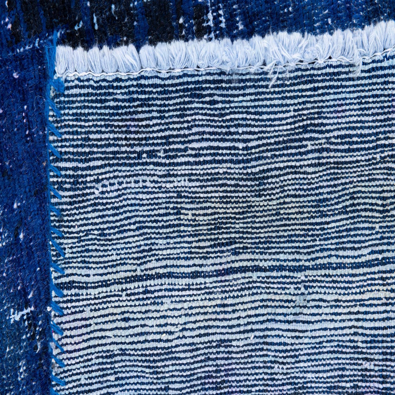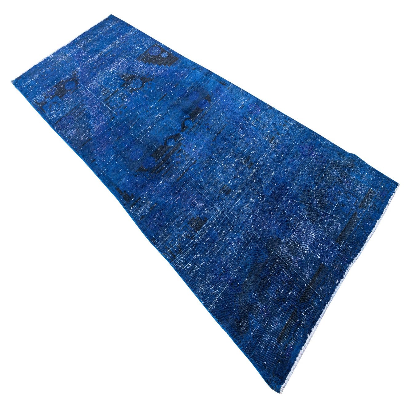 A 10 Ft runner rug in deep blues with a distressed, vintage Persian pattern, ideal for a hallway.