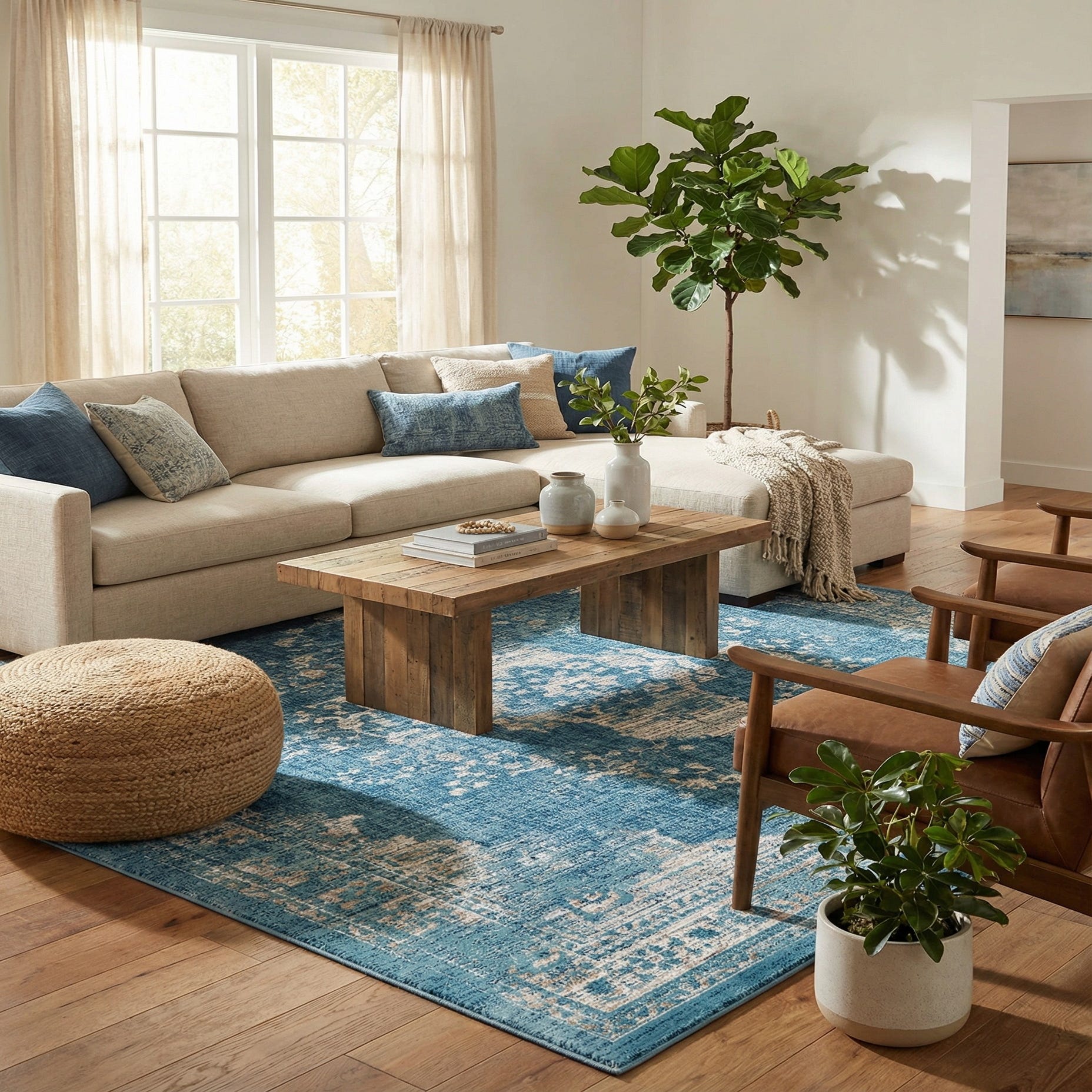 Machine made from 100% polypropylene, this piece offers a firm, supportive feel underfoot and lays flat for easy placement beneath seating areas or a dining table. It pairs well with light wood furniture and neutral upholstery for a coastal or transitional scheme, and it also anchors more traditional rooms where deep blues and muted accents bring warmth. Use it to define a living room conversation area, ground a bedroom seating nook, or add layered interest to an open-plan space.
