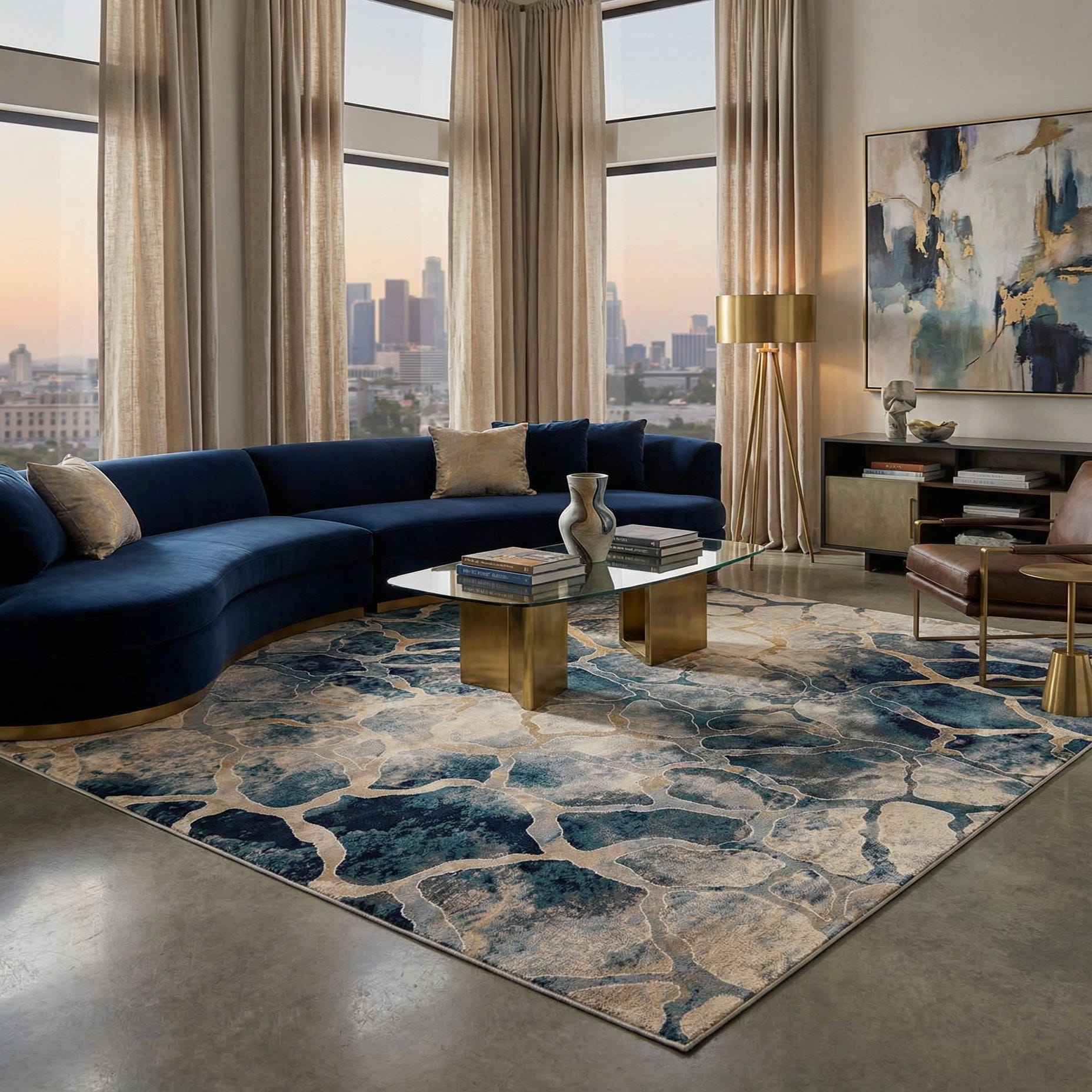 This piece works well as an anchor for a contemporary living room or a coastal-inspired seating area, pairing naturally with warm wood furniture, linen upholstery and brushed-metal accents. It also suits a transitional dining space or a home office, where the pattern adds visual interest without overwhelming other elements. Layer it over hardwood or pale tile to balance darker furnishings, or use it to introduce cool, oceanic tones into a neutral palette.