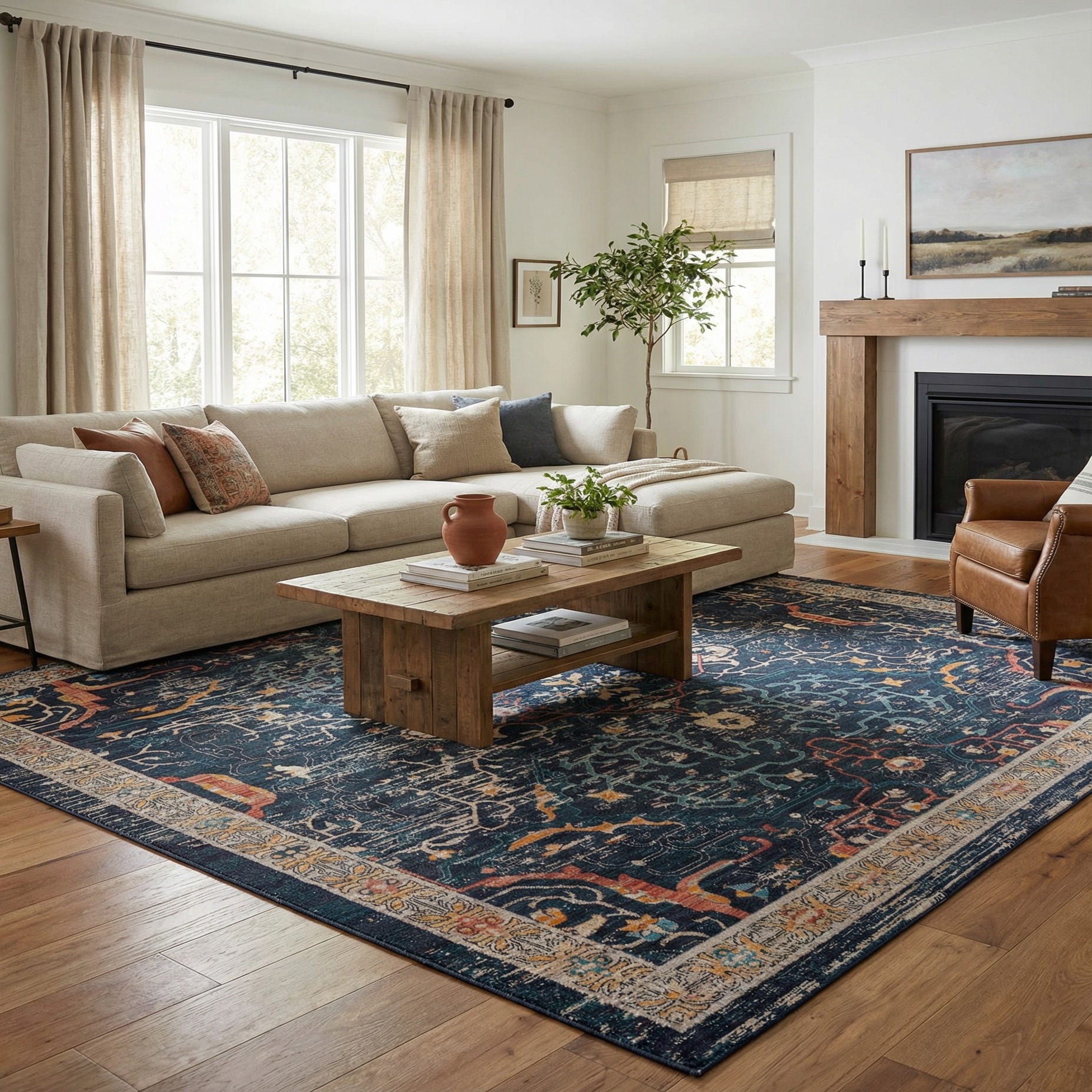Primary color is Navy Blue. Colors in this rug include: Navy Blue, Black, Ivory, Light Blue, Orange, Yellow, Rust Red.