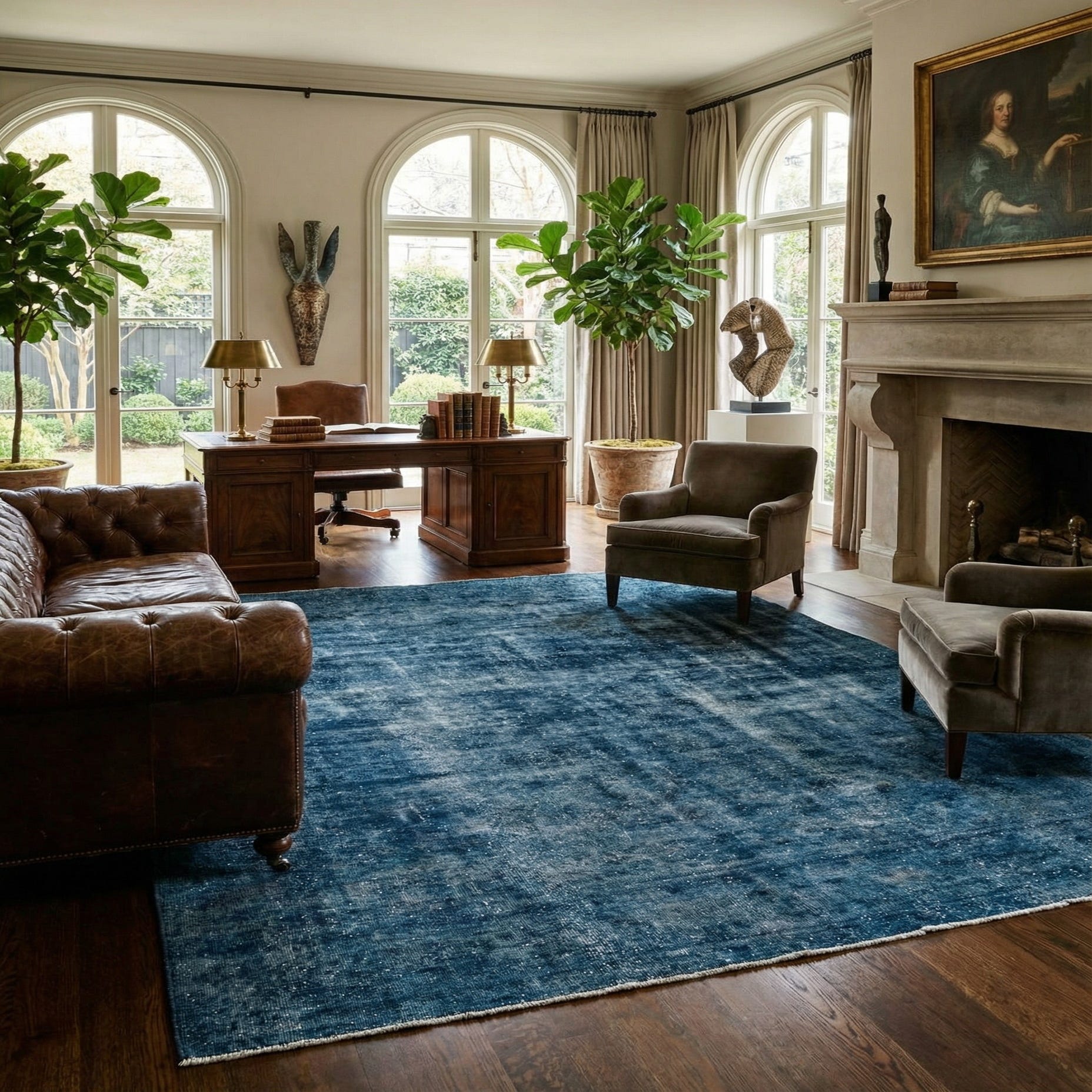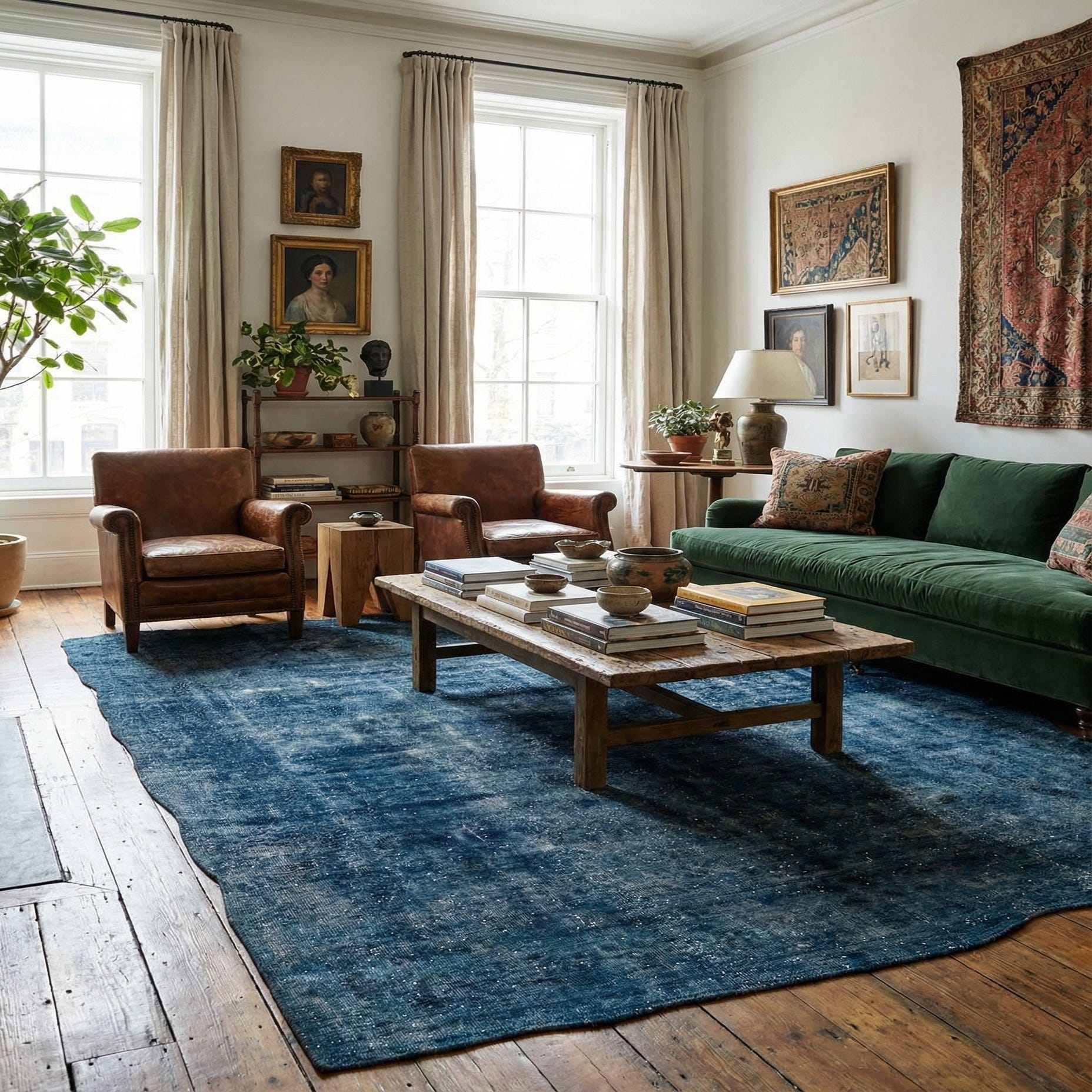 A deeply hued navy blue field anchors this hand-knotted, 100% wool rug, with layers of black shading and ivory speckling that create a quietly weathered, overdyed look. The design is intentionally restrained — subtle tonal variations and faint, worn motifs emerge as you move across the surface, while irregular, gently scalloped edges add a handcrafted character. Running your hand over the pile reveals a dense, low-to-medium wool pile with a soft, slightly plush feel and a muted luster that catches light without glare.