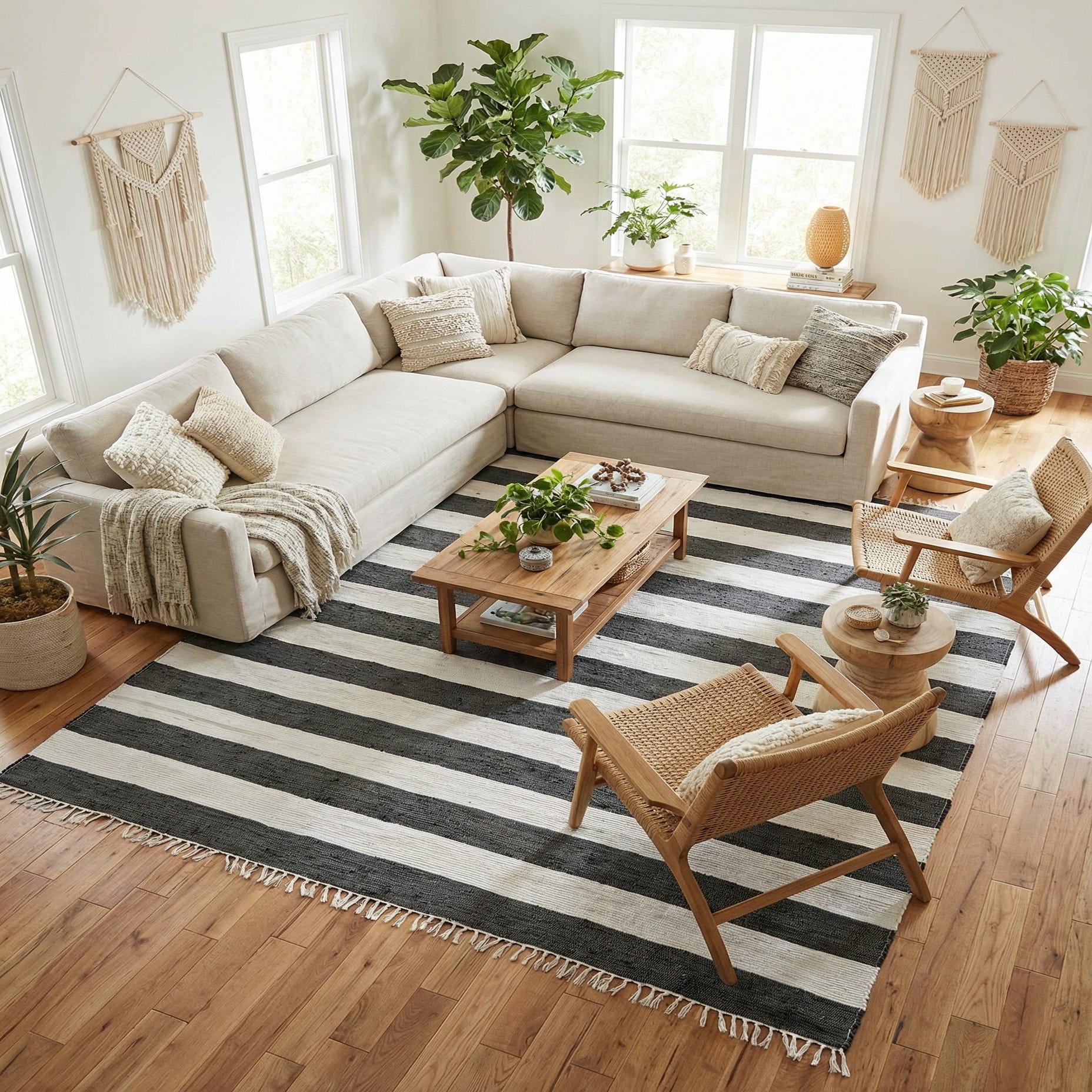 This stripe pattern and navy-and-ivory palette work well as a grounding piece in casual living rooms, dining areas, or sunlit family spaces. Pair it with natural wood furniture, linen upholstery, woven textures, or matte metal accents for a modern farmhouse or coastal-inspired look. Its graphic simplicity also makes it effective for defining seating groups, layering under a bed, or bringing order to an open-plan layout.