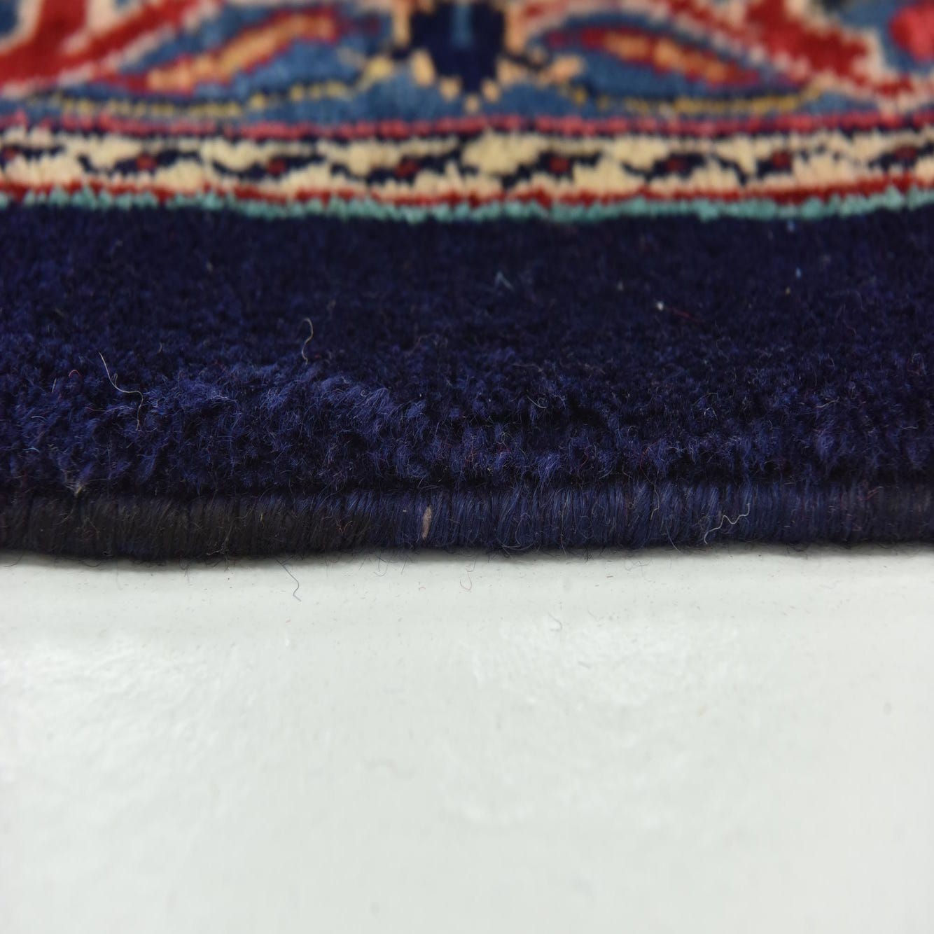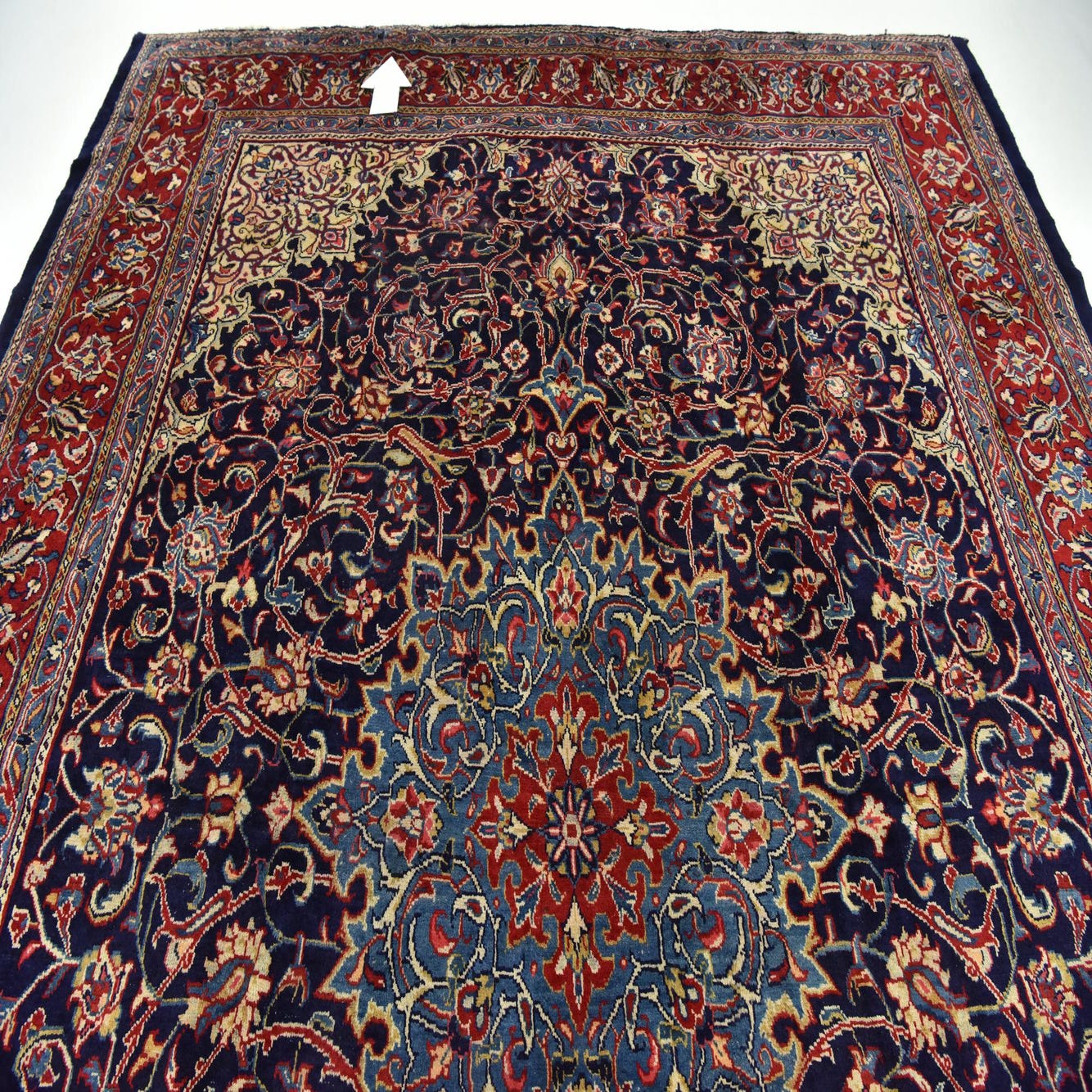 The texture of this hand-knotted rug affirms its durability and gives a nod to its craftsmanship. A repair in the rug has been expertly handled to maintain its integrity and continue its legacy. This rug's versatile color palette and detailed pattern allow for placement in a variety of decor settings. It would serve well as a focal point in a traditional living room, add warmth to a library, or bring sophistication to a formal dining area. Its timeless design pairs beautifully with rich wooden furnishings and is capable of complementing both subtle neutral tones and more vibrant color schemes.