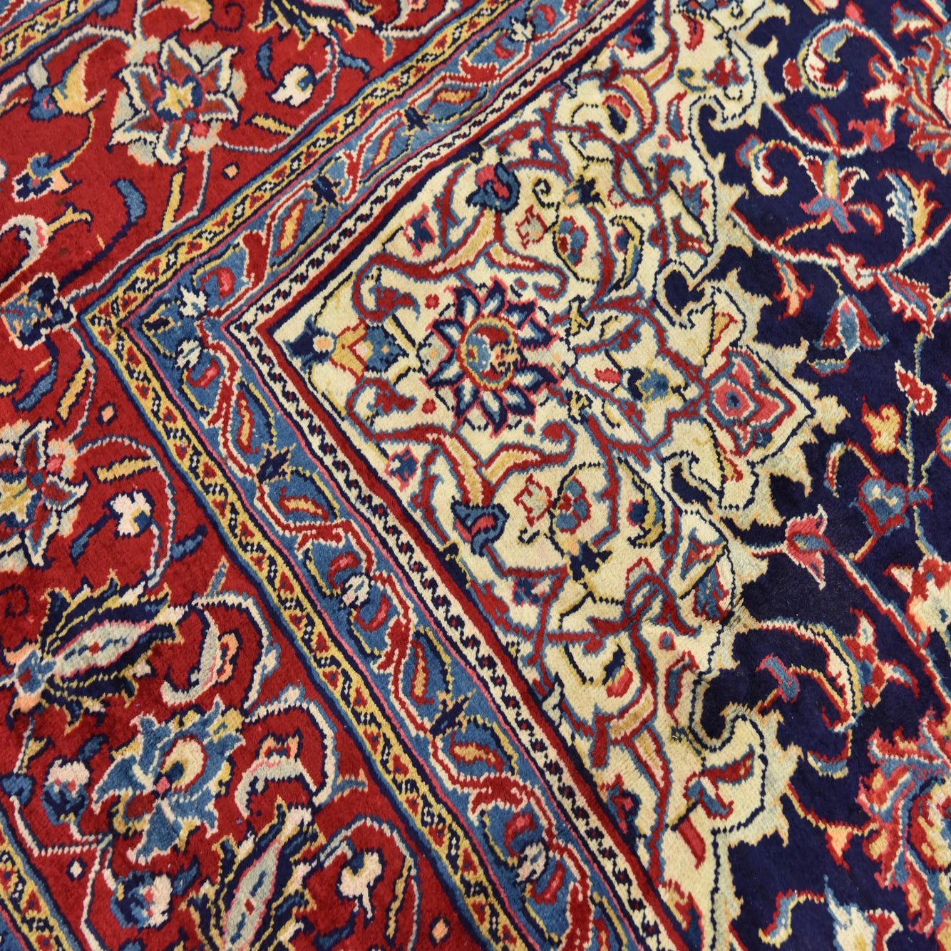 The Farahan collection presents this hand-knotted 10x13 rug, crafted meticulously from 100% wool. This semi-antique piece, dated between 40 to 60 years old, brings a depth of history and character to any interior. The rug showcases a rich navy blue background, providing a dramatic canvas for the intricate pattern work that displays an array of colors, including beige, black, blue, green, ivory, and pink highlights.