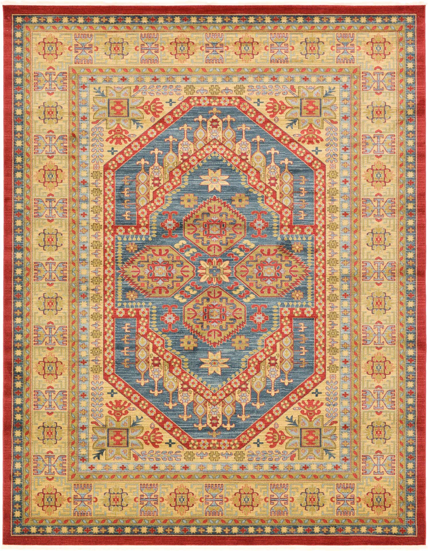 The Sara Collection offers a harmonious blend of traditional design and modern construction. This particular 10x13 rug boasts a deep navy blue background punctuated by patterns in a palette that includes blue, light brown, and red. The design is a melange of ornate motifs and medallions reminiscent of classic Persian textiles.