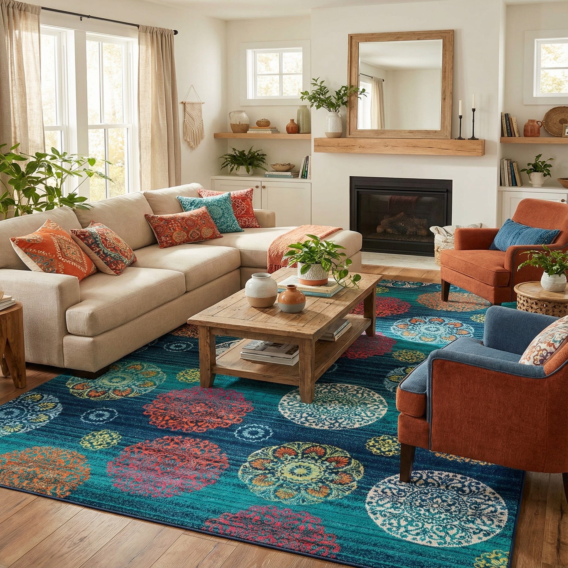 This vibrant-yet-grounded palette works well in contemporary living rooms, eclectic bohemian spaces, or coastal-modern interiors. Pair it with a neutral sofa and warm wood tones to let the pattern take center, place it beneath a glass-top dining table to add color without visual clutter, or use it in a family room or play area where pattern and easy-care construction complement everyday use.