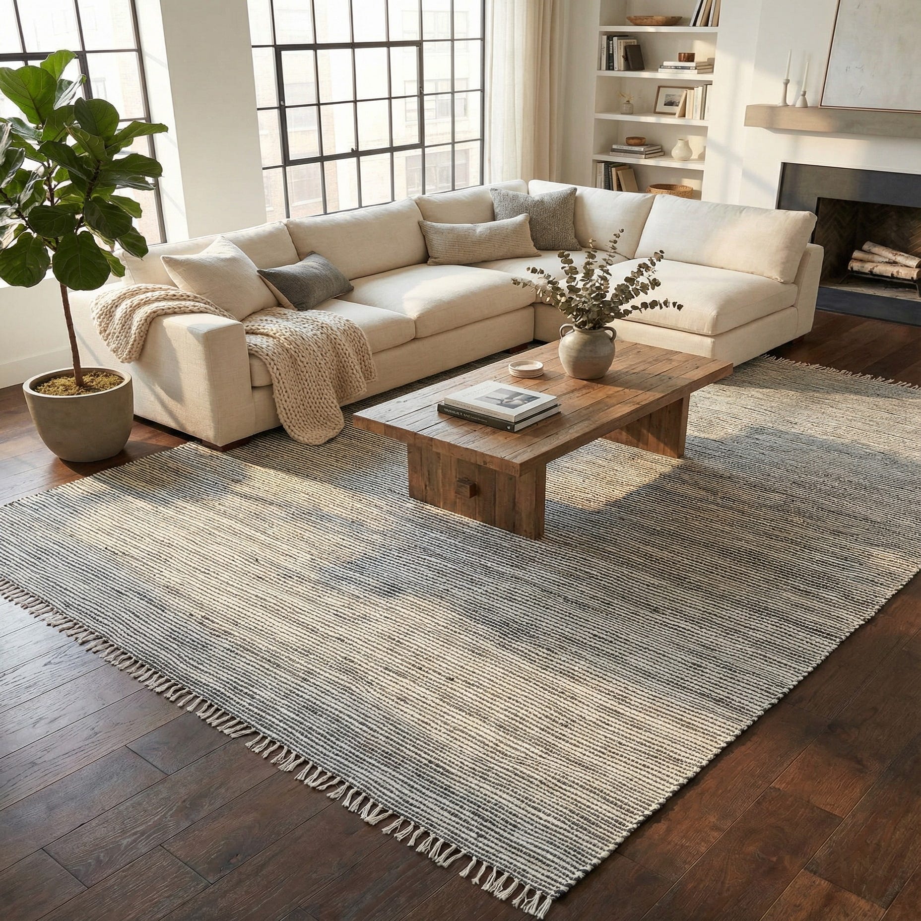 This rug works well in casual and transitional interiors—place it under a sofa and coffee table to anchor a living area, beneath a dining table for a warm, grounded base, or layered in a bedroom to introduce pattern without excess pile. Pair the navy background with light-wood furniture, linen upholstery and brass or matte-black accents for a coastal-modern or farmhouse-inspired scheme, or use it in a home office or entry to add linear interest and a calming color anchor.