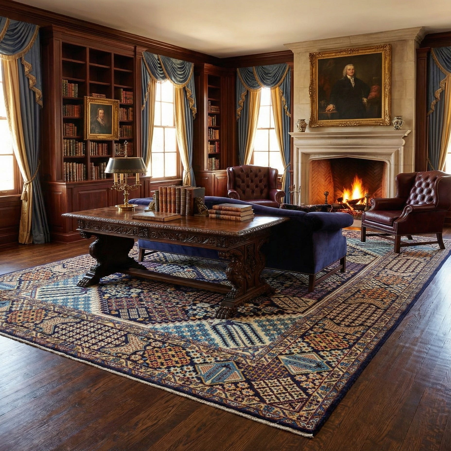 Decoratively versatile, this rug would effortlessly elevate the aesthetics of traditional, transitional, or even eclectic interiors. It can serve as a focal point in a formal living room or dining area, providing a sense of grandeur and timeless elegance. Moreover, the rug's robust navy base allows it to anchor spaces with high foot traffic while maintaining its visual appeal.