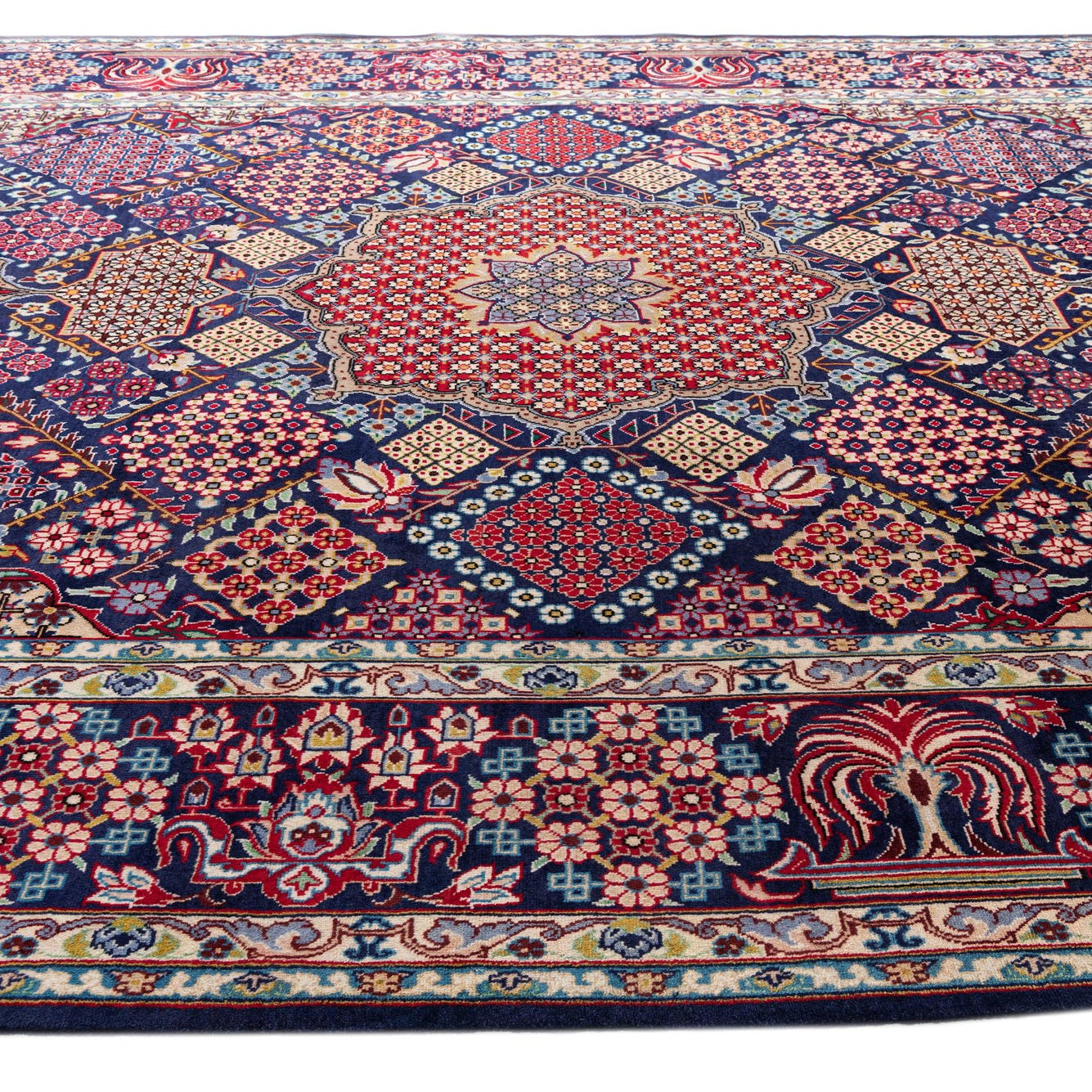 A large 10x14 rectangular Isfahan rug featuring a complex traditional Persian medallion and botanical pattern in deep blues, reds, and creams.