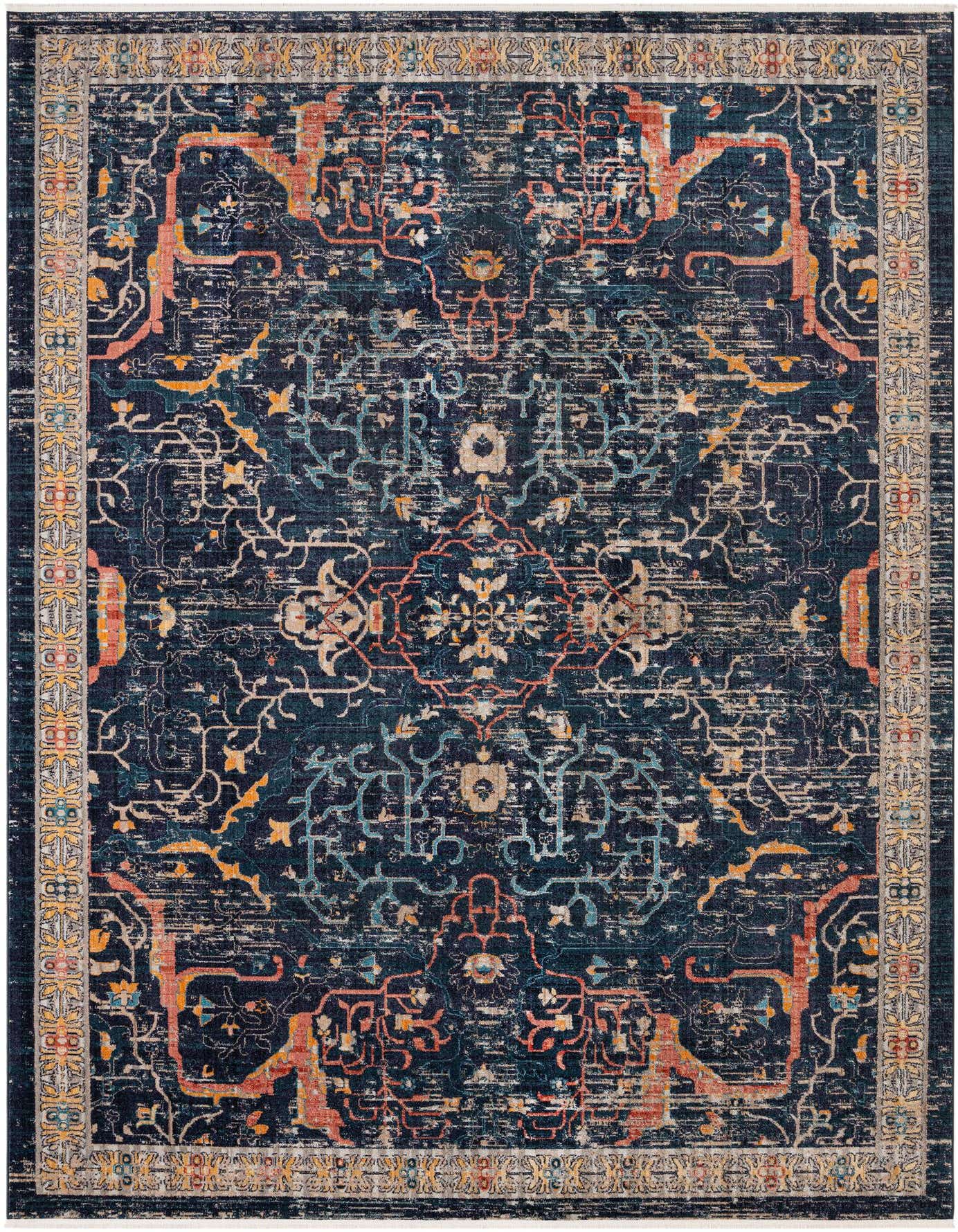 Primary color is Navy Blue. Colors in this rug include: Navy Blue, Black, Ivory, Light Blue, Orange, Yellow, Rust Red.