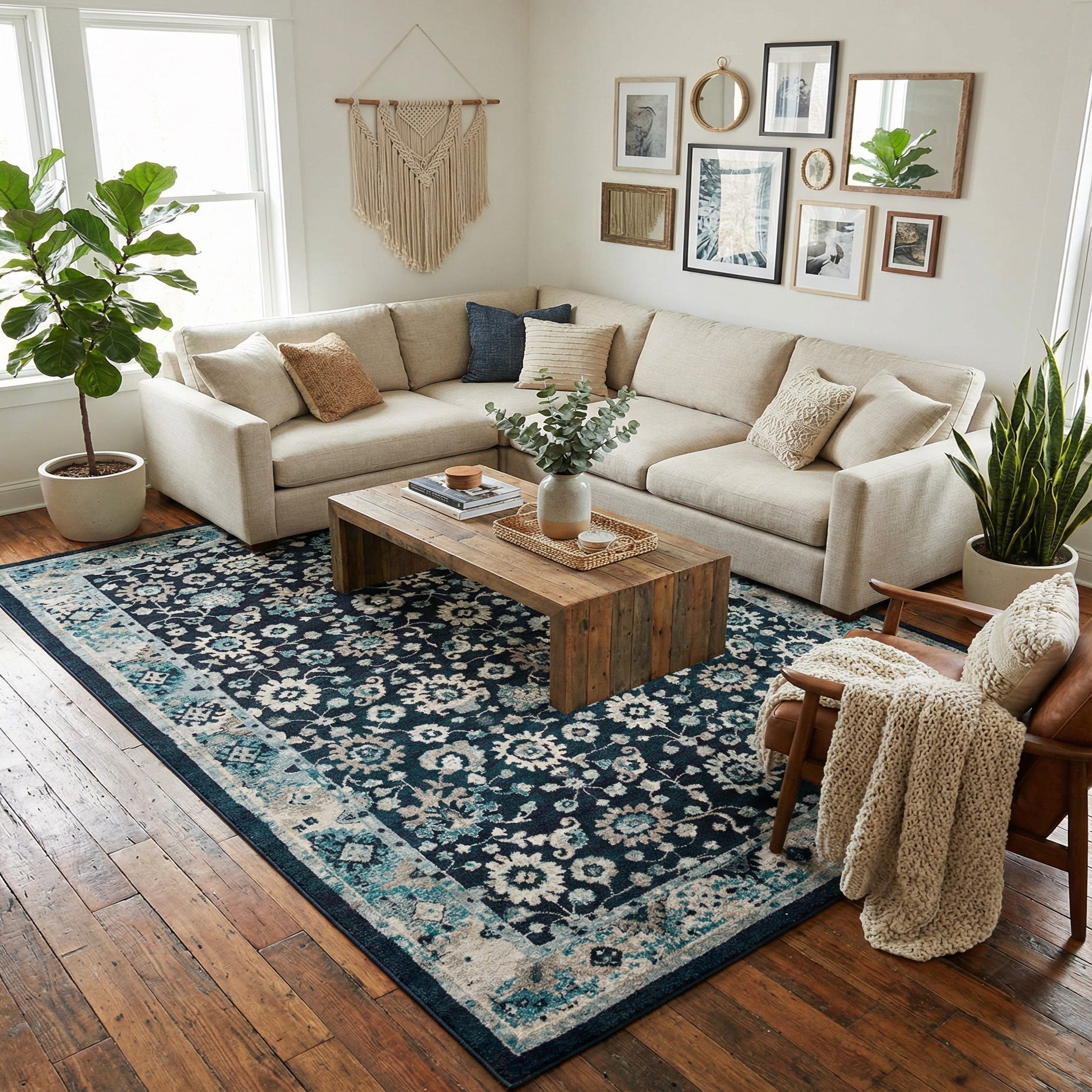 Primary color is Navy Blue. Colors in this rug include: Navy Blue, Beige, Blue, Ivory.