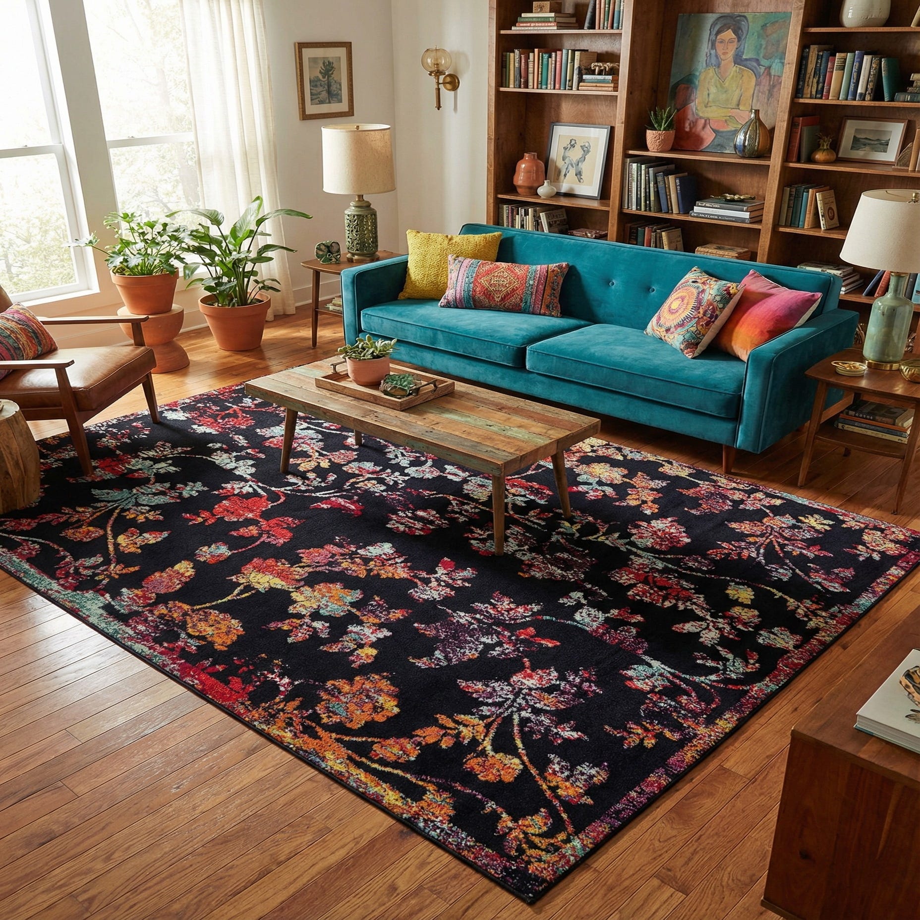 Primary color is Navy Blue. Colors in this rug include: Navy Blue, Blue, Ivory, Light Blue, Red, Yellow, Orange, Purple.