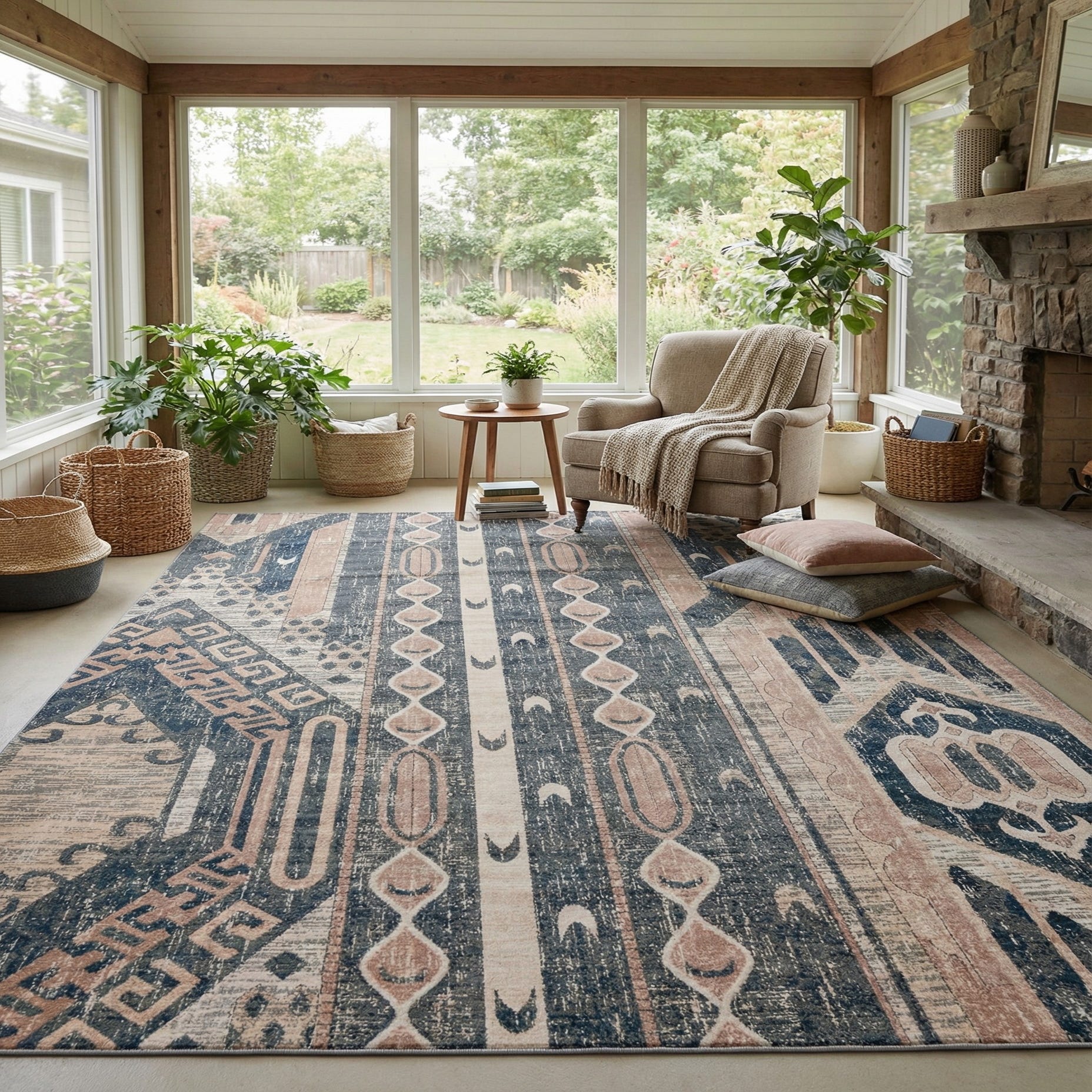 A large 10x14 rectangular Rugs.com Oregon rug featuring a distressed bohemian pattern in shades of navy blue, beige, and brown.