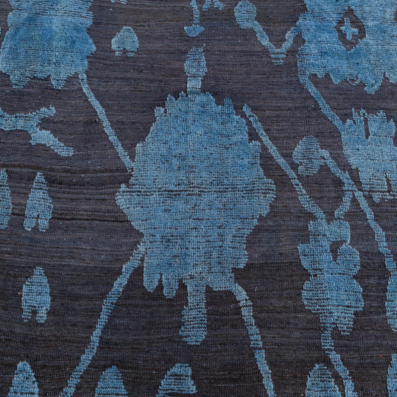 A large 10x14 rectangular navy blue wool rug with a modern Oushak pattern in lighter blue tones.