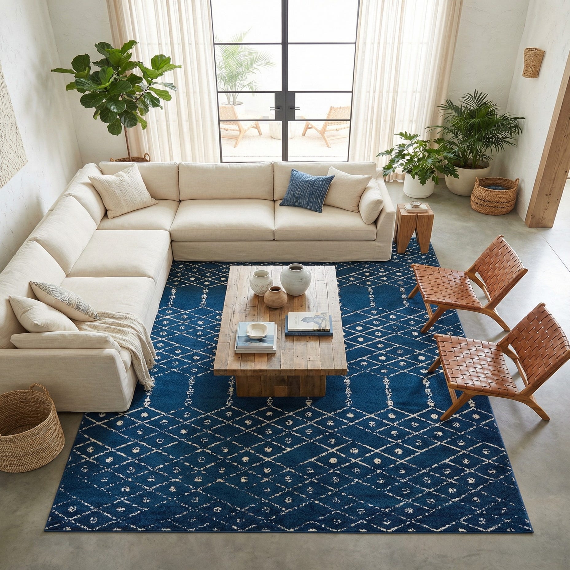 The navy-and-ivory palette and geometric motif work well in a variety of interiors—place it to anchor a living room seating area, beneath a dining table to add contrast to warm wood, or at the foot of a bed in a coastal or transitional bedroom. It pairs nicely with light linens, natural wood tones, and metal accents in brass or matte black, bringing a grounded, layered look to both casual and more refined spaces.