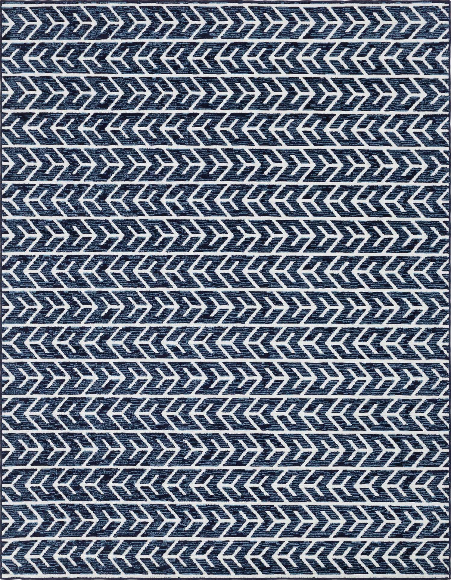 This rug would complement a variety of decor styles, including contemporary, coastal, and transitional interiors. It can provide a sophisticated grounding element in an outdoor lounge area, a busy living room, or even under a dining table where durability and ease of cleaning are paramount. Its bold pattern and color scheme make it an excellent choice for adding visual interest to a neutral space or for coordinating with navy and light blue decor elements to create a cohesive look.