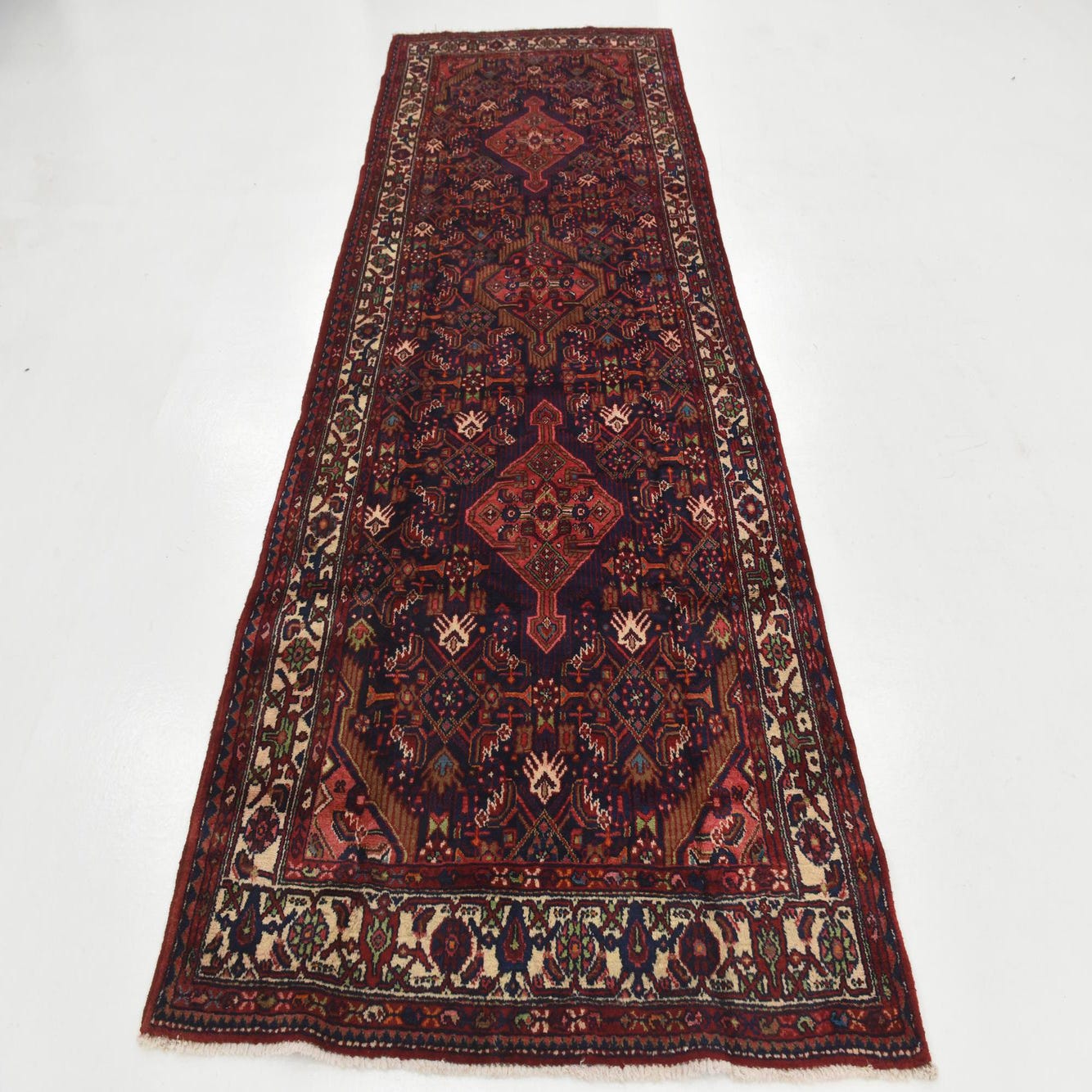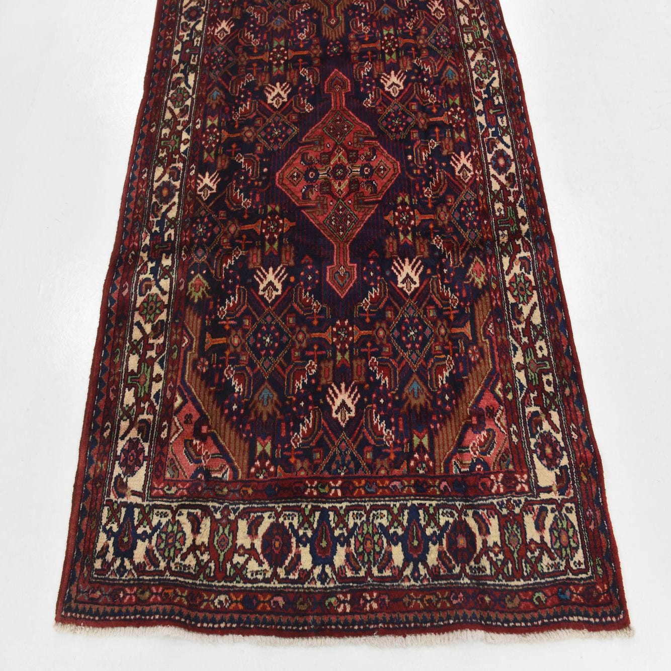 The Darjazin collection presents a hand-knotted 11 Ft runner rug, crafted with the utmost precision from 100% wool. This semi-antique piece showcases a robust navy blue background, elegantly overlaid with intricate patterns featuring hues of blue, green, ivory, orange, peach, red, and terracotta. Its detailed design displays traditional motifs which are evenly distributed throughout the rug, conveying a sense of balance and rich cultural heritage. The delicate fringe adds a classic finishing touch to the runner's edges.