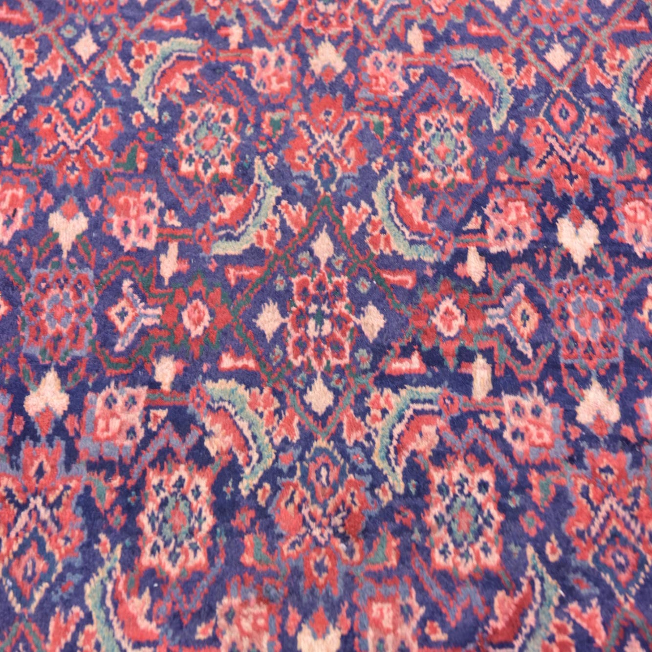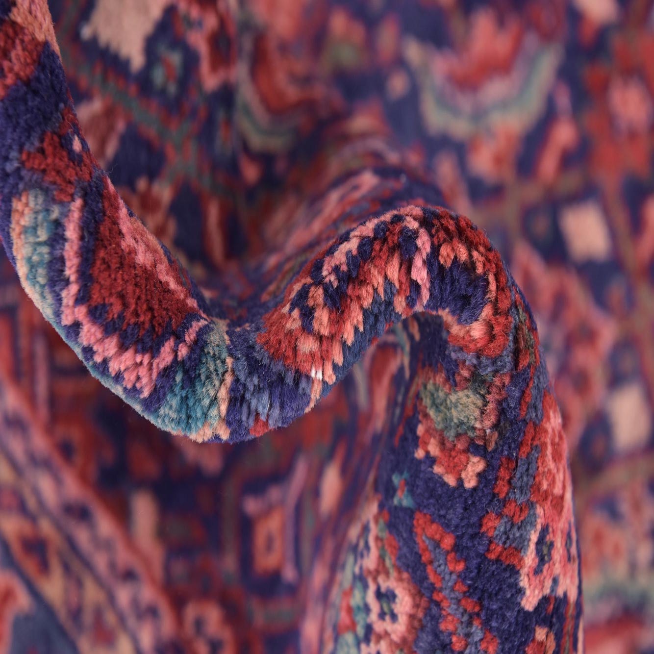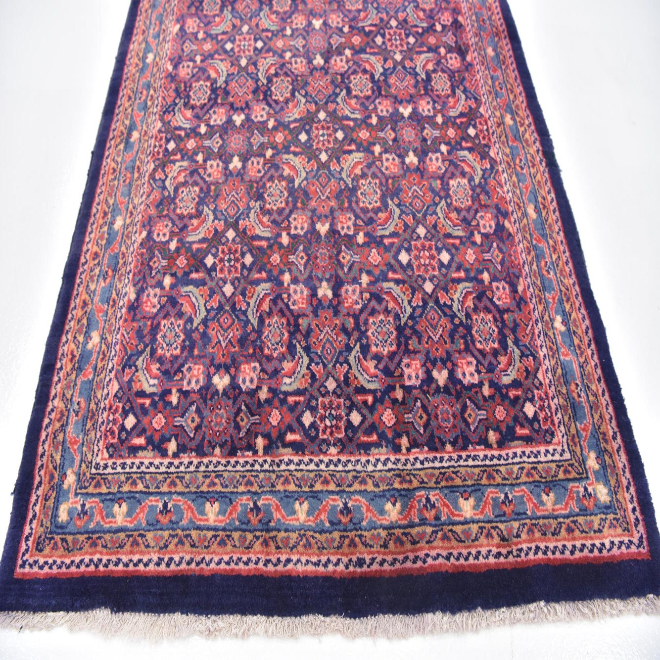 A handmade 11 ft Farahan runner rug in deep blues and reds featuring a detailed tribal pattern, ideal for a hallway.