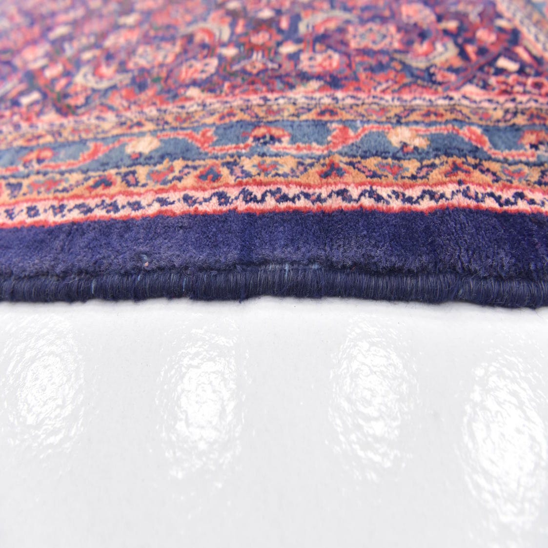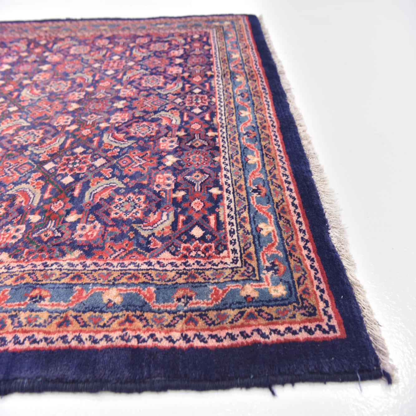 The rug exhibits characteristics of a semi-antique piece, being 40-60 years old, with condition details such as low pile spots which contribute to its authentic charm. The presence of fringe on either end reinforces its classic styling.