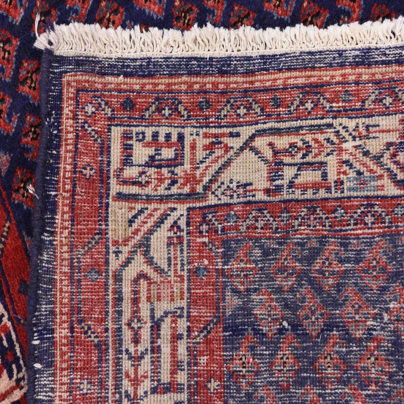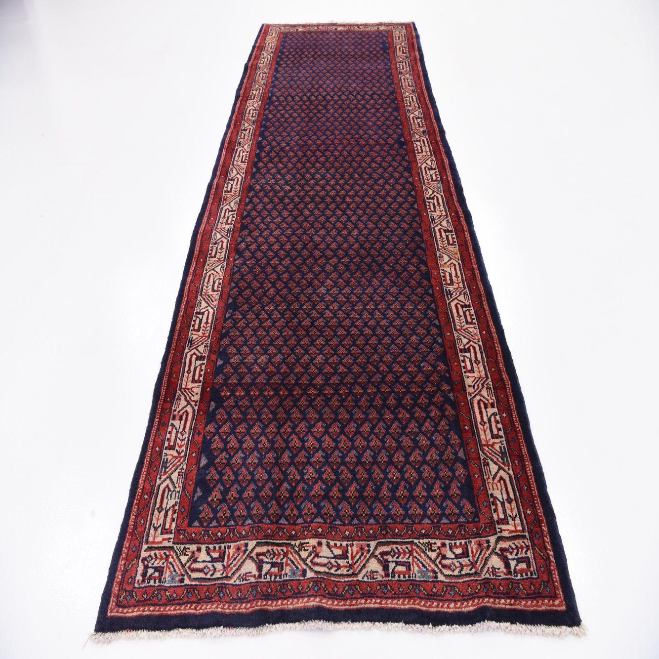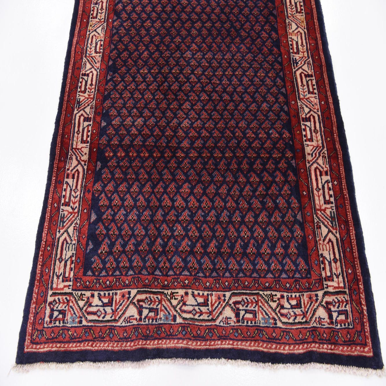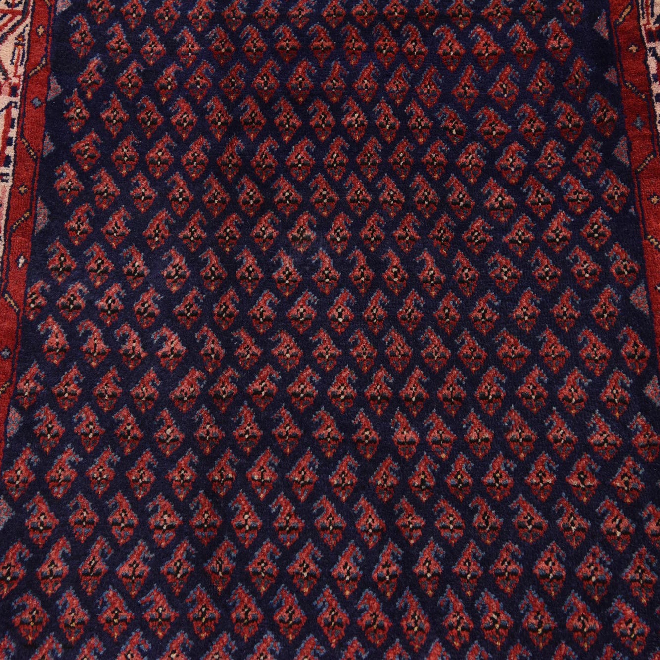 The Farahan collection presents a hand-knotted 11 ft runner, crafted with 100% wool, characterized by a deep navy blue background. This semi-antique rug, aged approximately 40-60 years, features a detailed geometric pattern interspersed with motifs in shades of blue, green, ivory, red, and peach. The border accentuates the craftsmanship with a layered frame that complements the intricate field design. A texture that conveys the richness of traditional weaving techniques is apparent, providing not only visual depth but also a tangible sense of heritage.