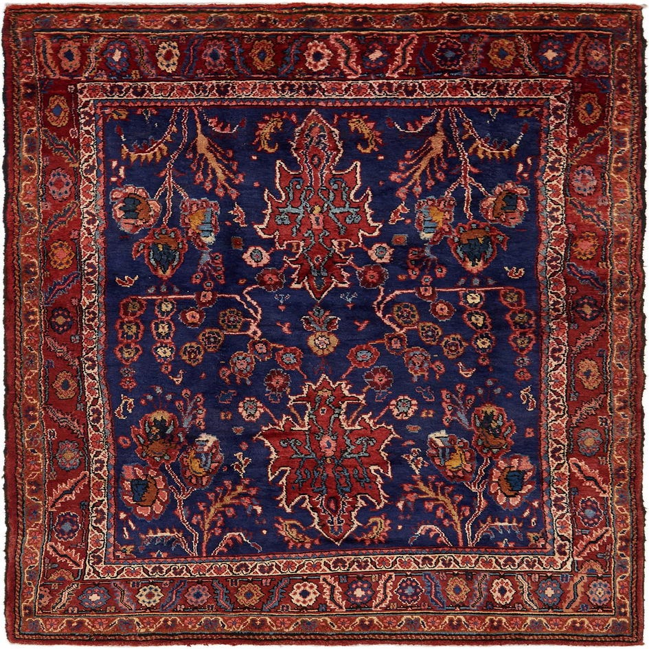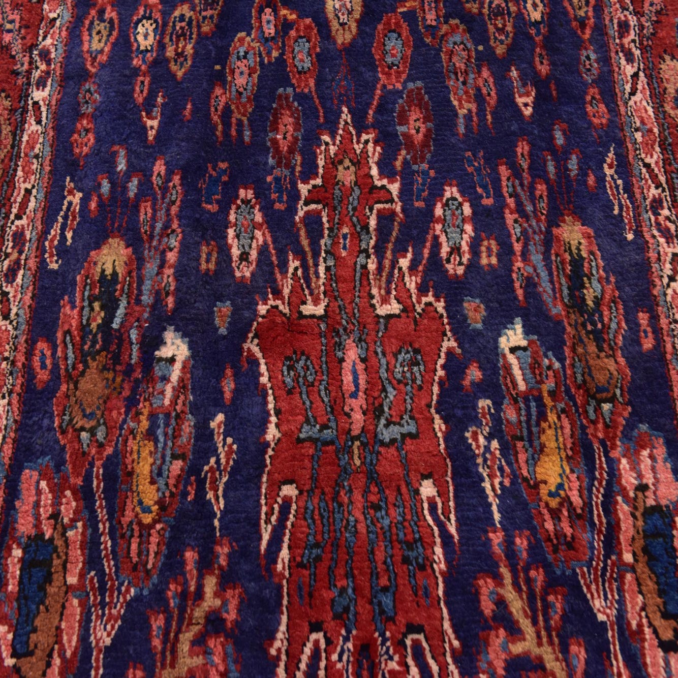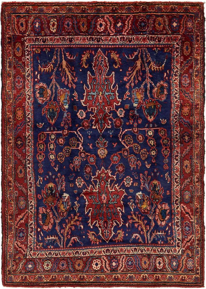 Primary color is Navy Blue. Colors in this rug include: Navy Blue, Blue, Olive, Orange, Beige, Red, Ivory, Salmon.