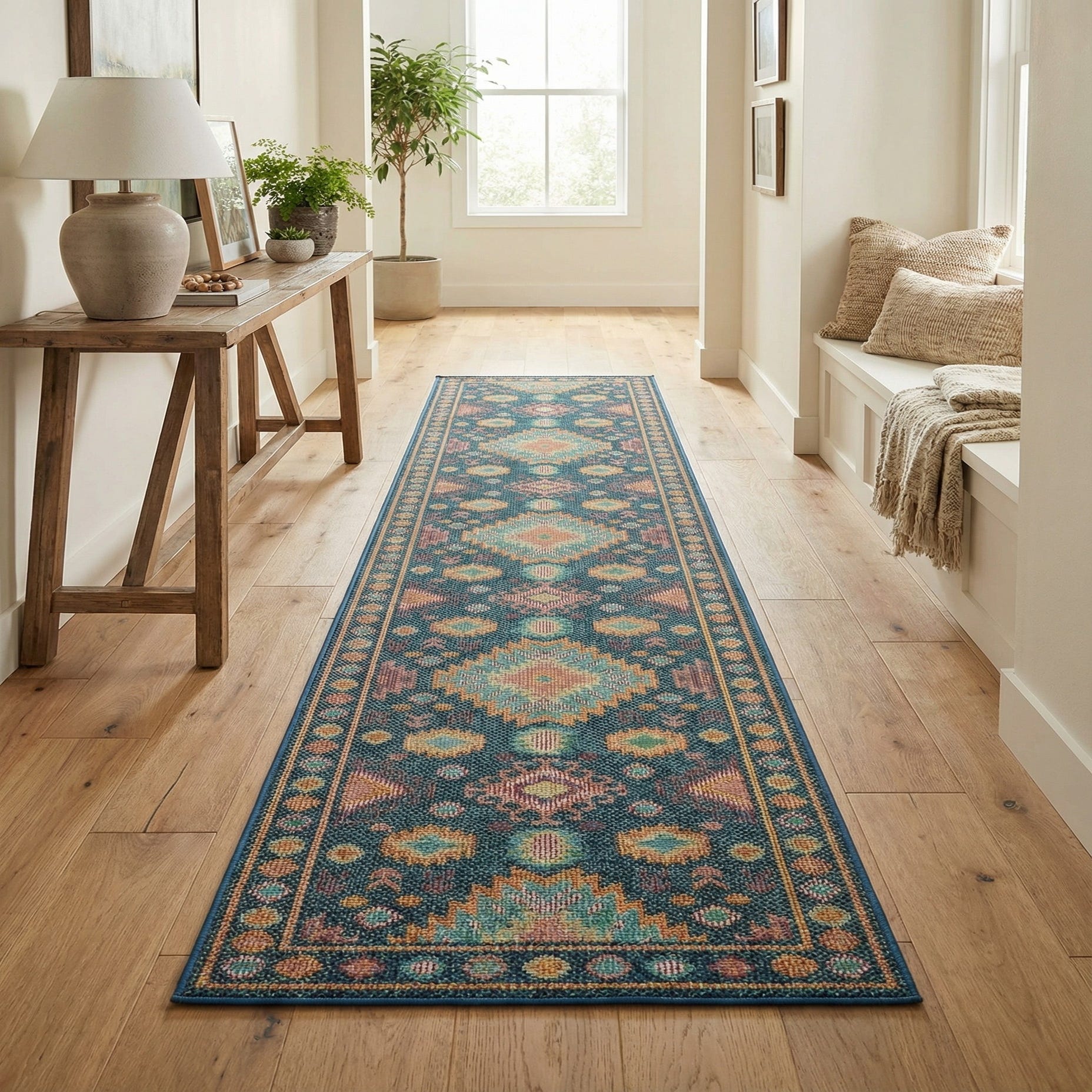 A 12 ft runner rug with a Southwestern tribal pattern in shades of blue, orange, and teal, suitable for a hallway or patio.