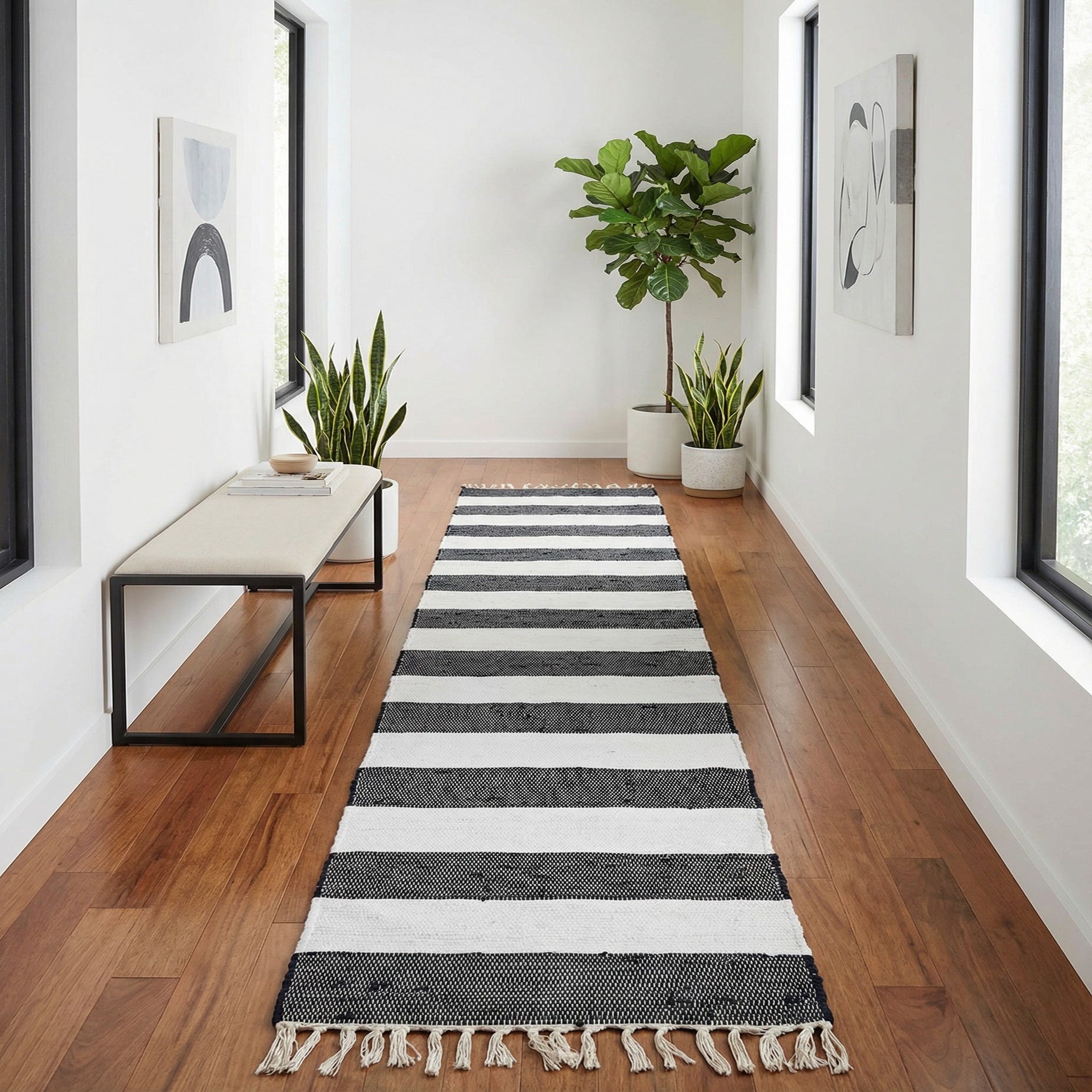 This runner works well in narrow, high-traffic spots like hallways, entryways, and kitchen aisles, and it layers nicely over a larger neutral rug for added depth. It complements coastal and modern farmhouse schemes, pairs cleanly with contemporary minimalist interiors that need a bold linear accent, and balances warmer wood tones or black metal furnishings in transitional spaces.