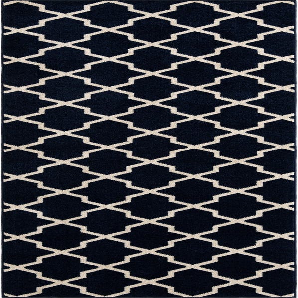 A 12 ft navy blue runner rug with a repeating cream-colored modern lattice pattern, ideal for a hallway.