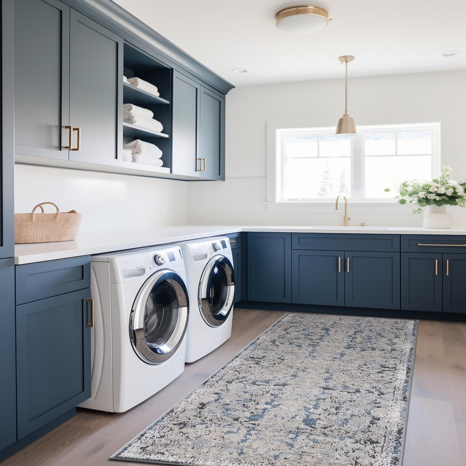 Well-suited for long, narrow spaces, this runner works in hallways, entryways, or alongside a kitchen island to add pattern and color without overwhelming the room. Pair it with warm wood floors and neutral upholstery for a transitional feel, or use it to ground navy or gray bedding and furniture in a bedroom. The mix of classic medallion elements and relaxed distressing also complements coastal, farmhouse, and modern-traditional interiors.
