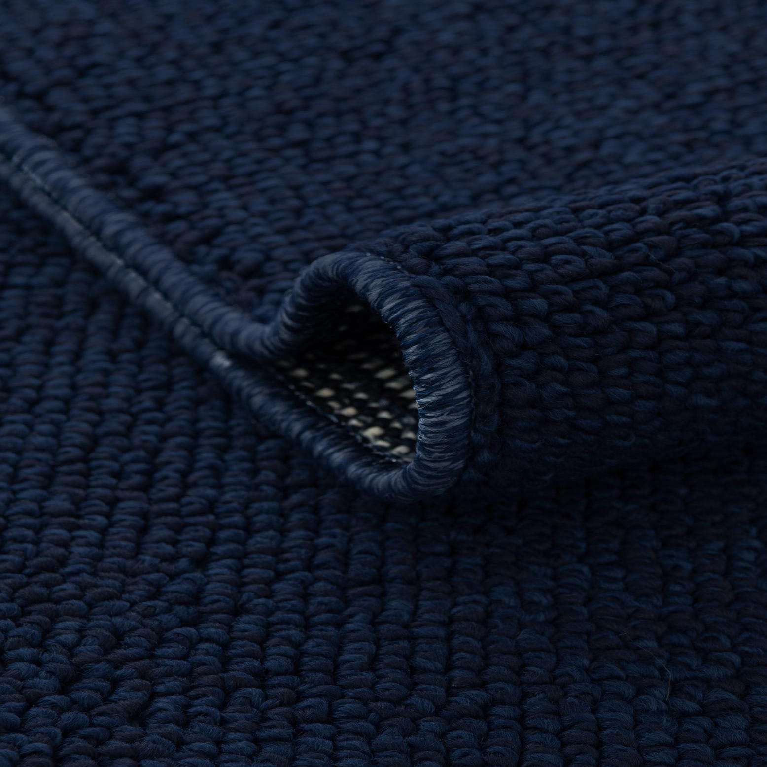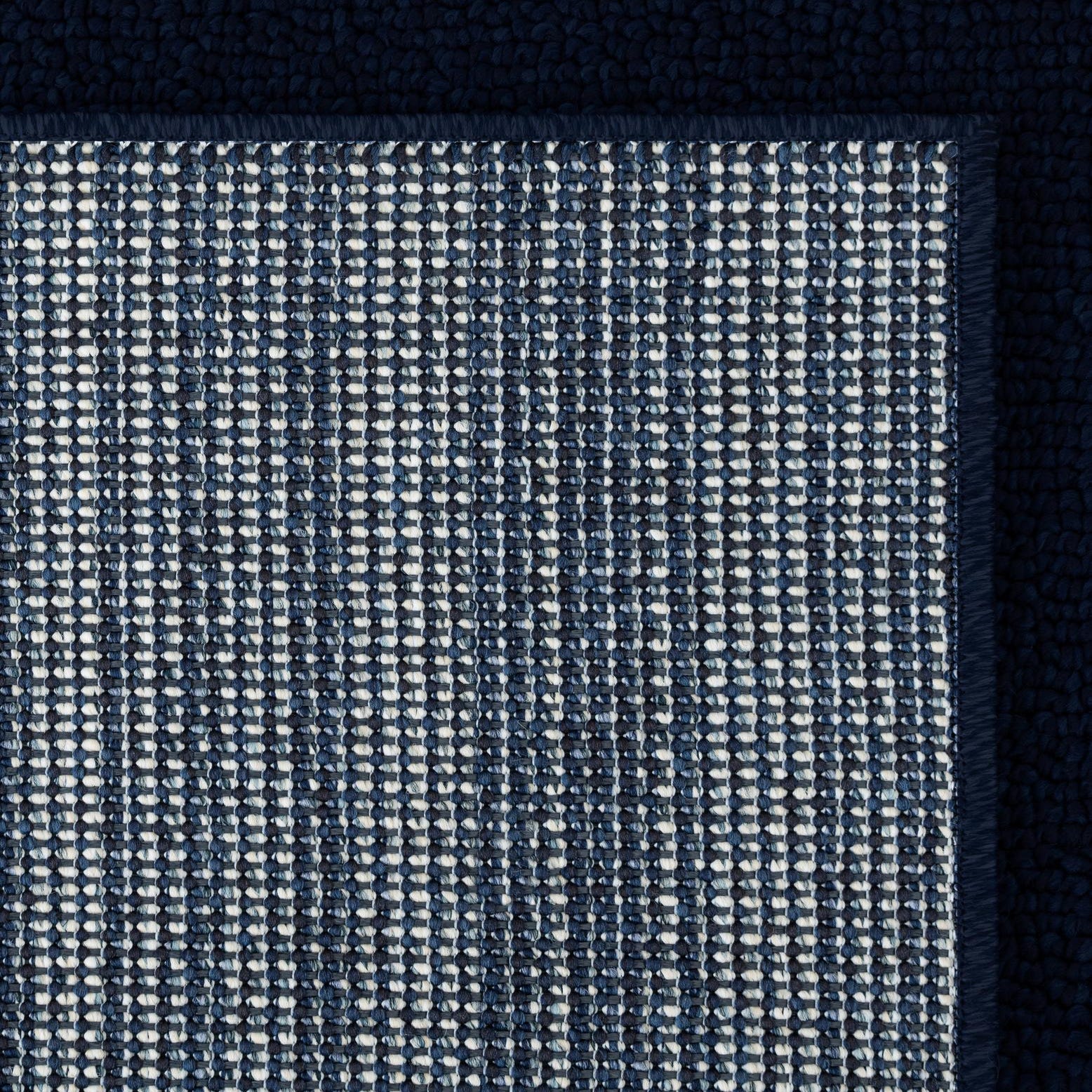 A 12 ft navy blue runner rug with a flat, textured pile, suitable for hallways or outdoor patios.