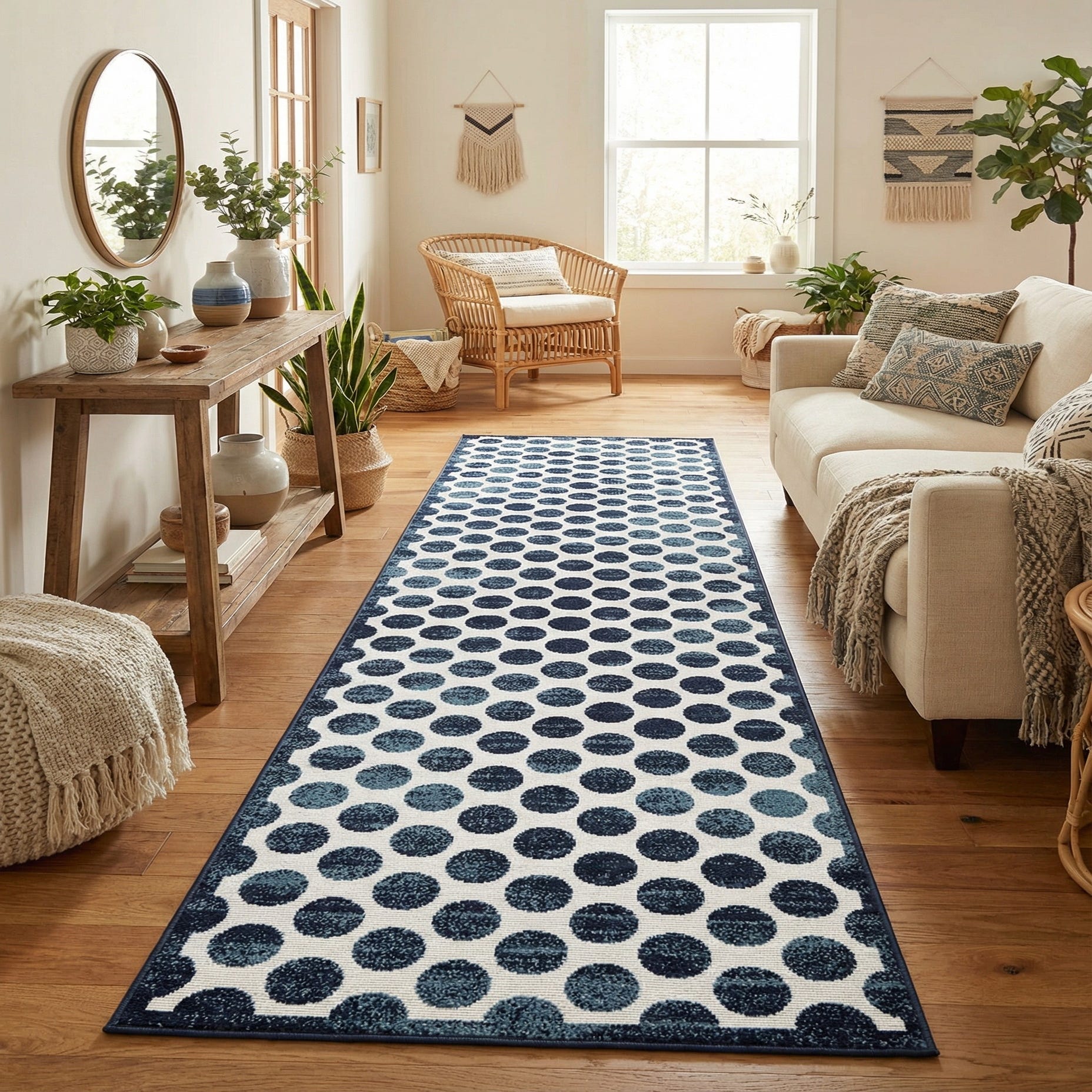 A 12 ft runner rug with a modern pattern of alternating dark blue and lighter blue textured ovals on a white background, framed by a dark blue border.