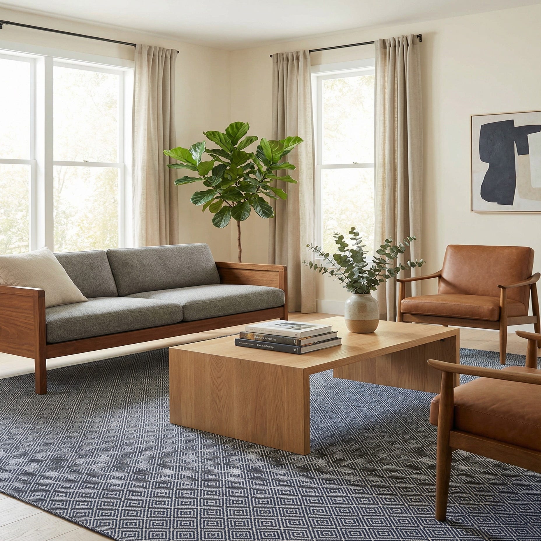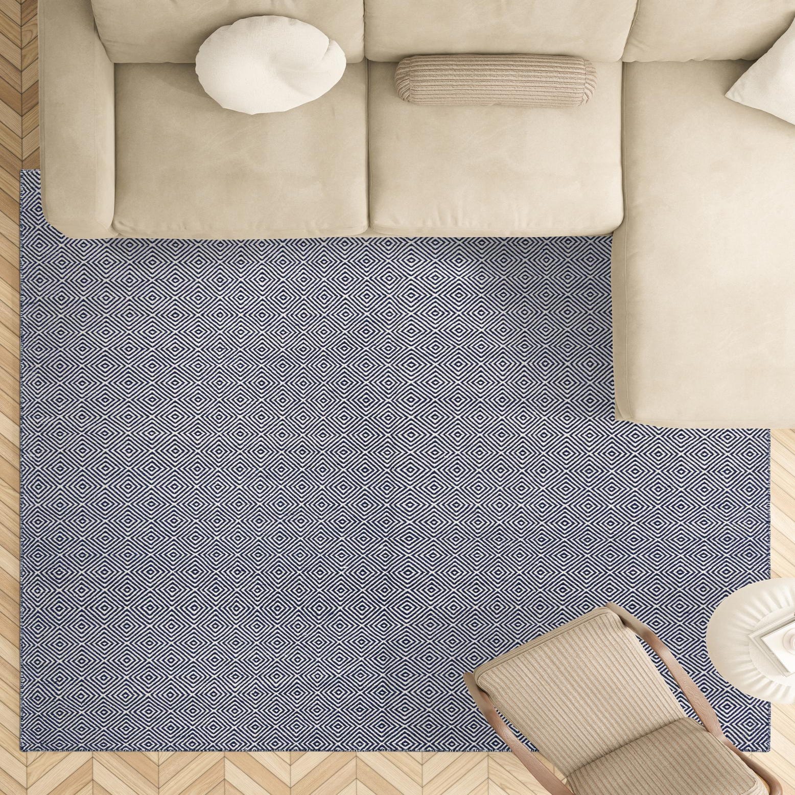 A 12'x12' square navy blue flatweave rug with a repeating geometric trellis pattern, suitable for a living room.