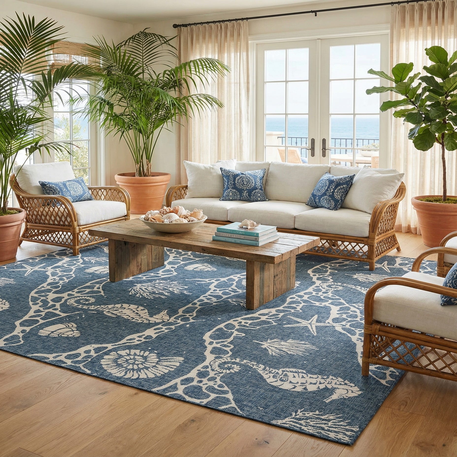 This rug fits naturally in covered outdoor living areas, screened porches, sunrooms, or poolside lounges, and also works well in casual coastal living rooms and dining spaces. Pair it with weathered wood furniture and natural-fiber accents for a beach-house vibe, or use it to anchor a navy-and-white scheme with light linens and brushed-metal hardware for a cleaner, more modern coastal look.