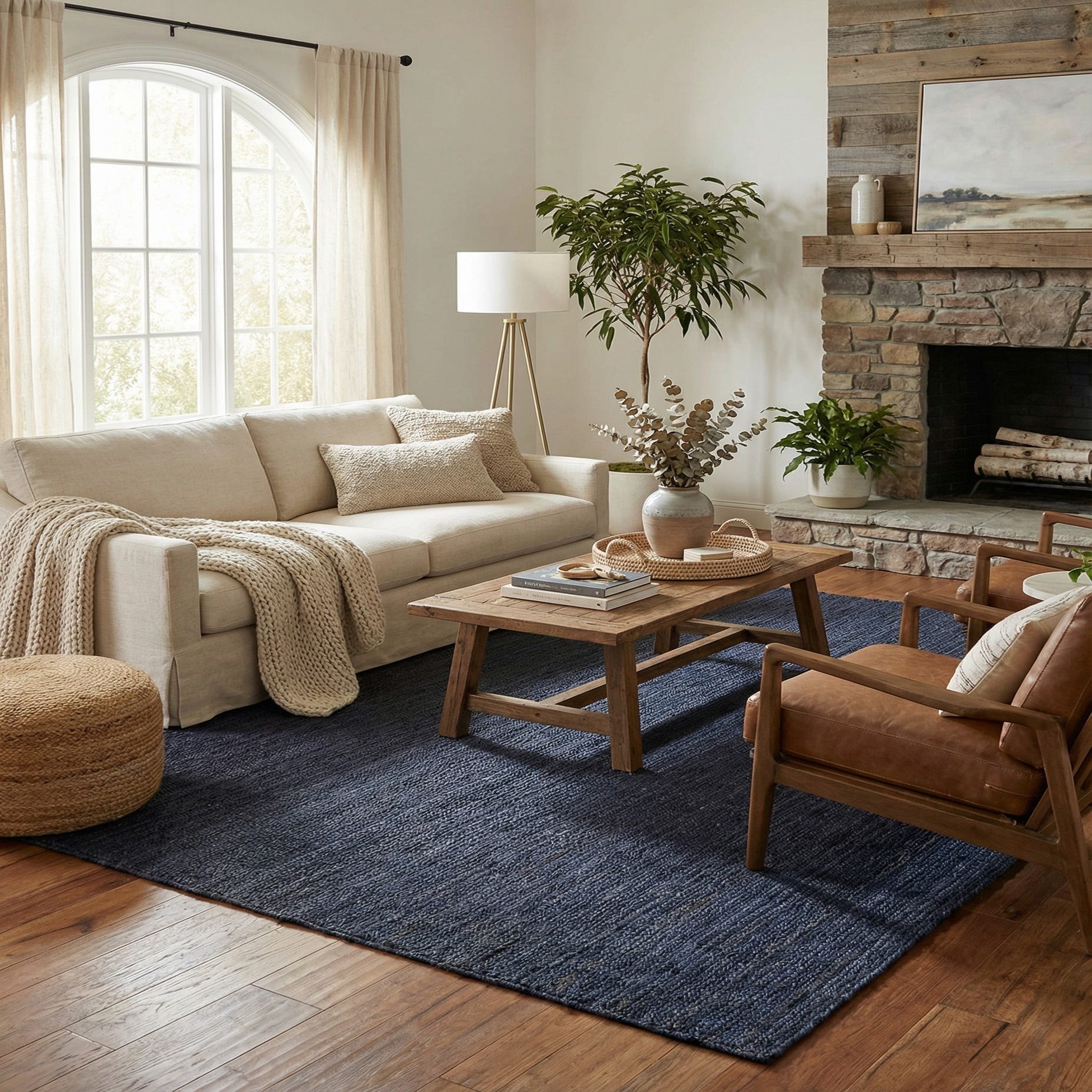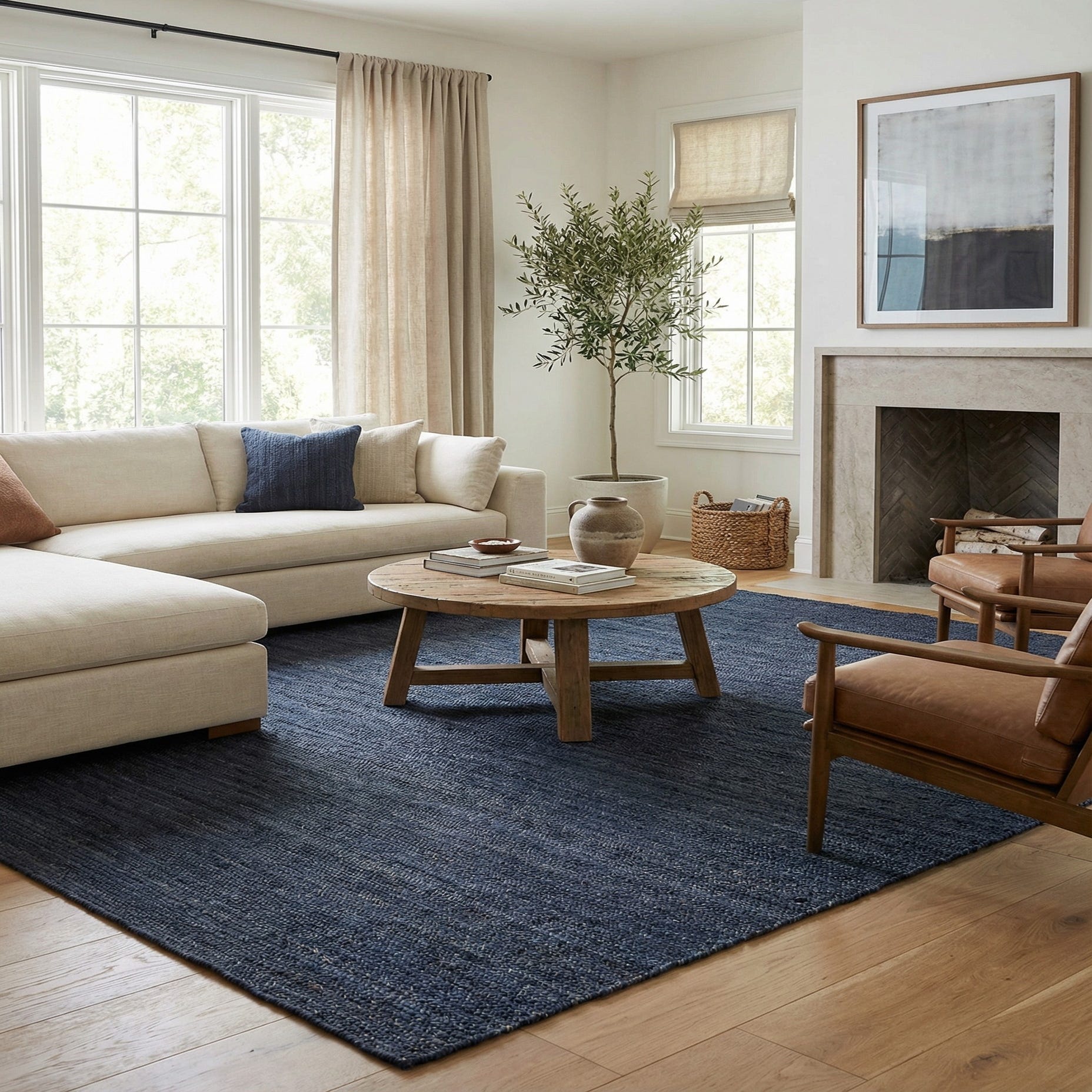 The rich navy provides a strong anchor for a room without overwhelming other elements, making this rug a versatile choice for living rooms, dining areas, or a home office. It pairs naturally with warm wood tones, leather seating, or light linen upholstery and fits well in coastal, modern farmhouse, and transitional interiors. Use it as a main floor covering to add structure and texture or layer it over hardwoods to create a composed, lived-in look.