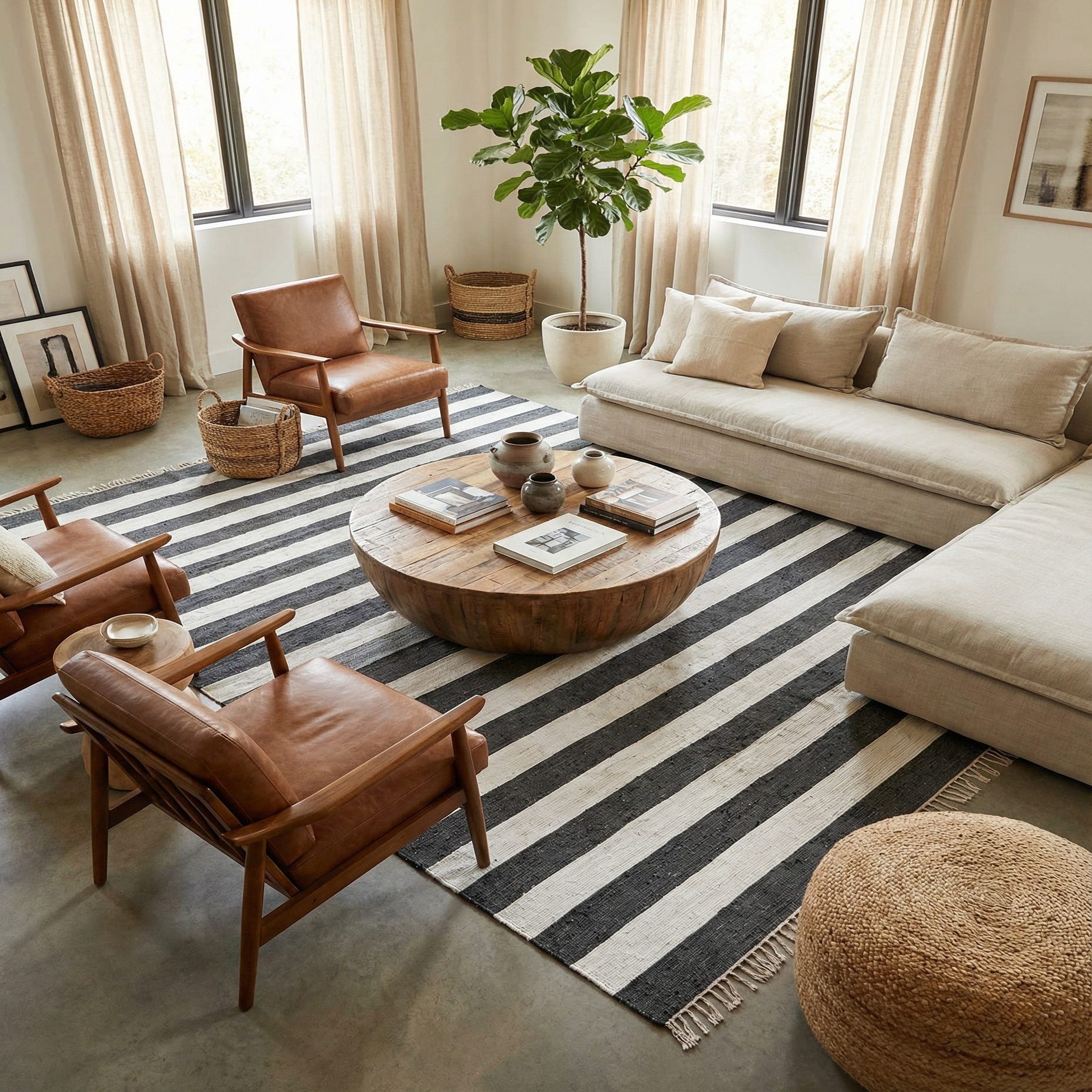 The rug’s straightforward palette and linear layout work well in modern, coastal, or Scandinavian-inspired rooms. Place it to anchor a living area beneath a sofa and coffee table, beneath a dining table to define the eating zone, or layered over a natural-fiber rug for added depth and contrast. It pairs naturally with warm wood tones, linen upholstery, and simple metal accents for a pared-back but collected look.