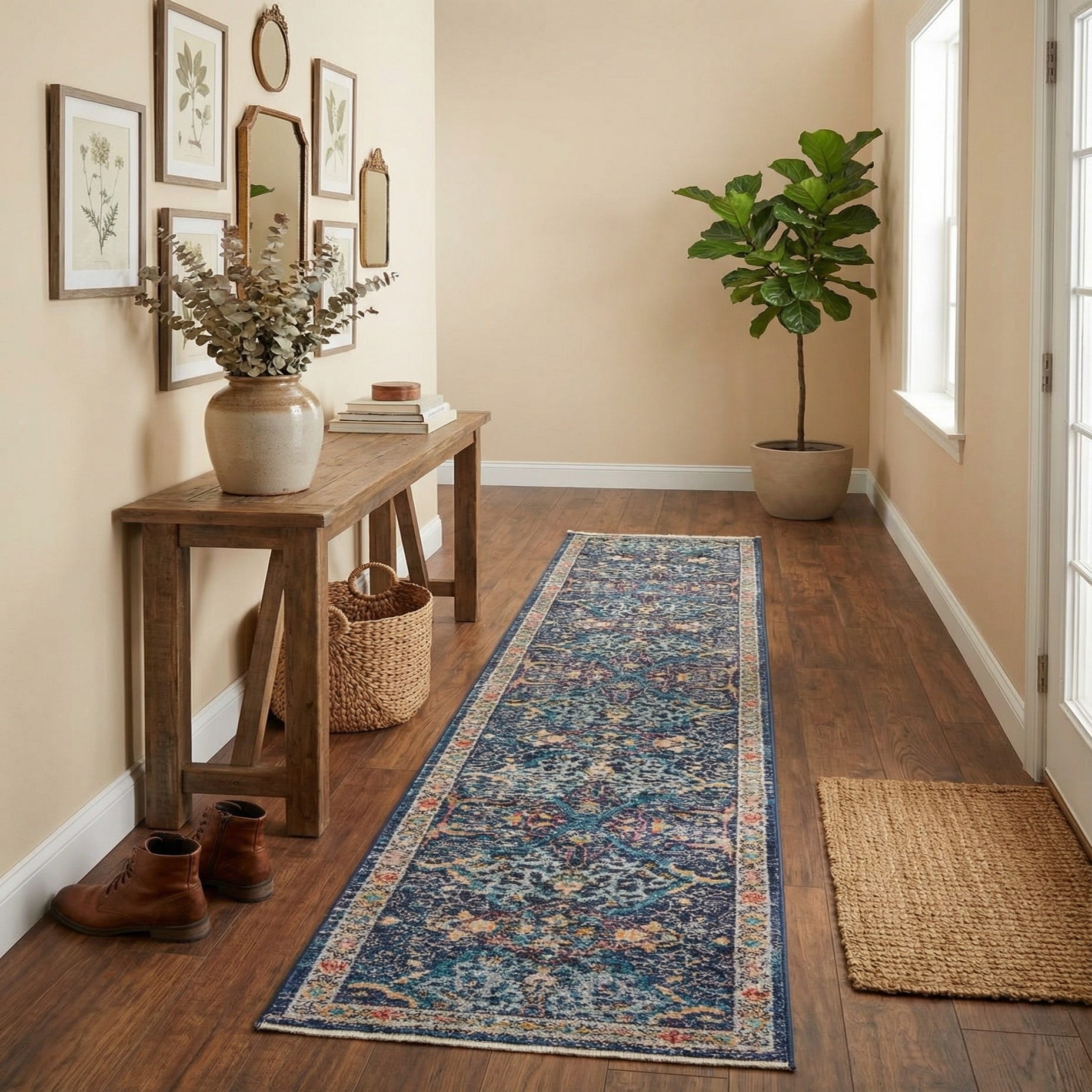 Ideal for long, narrow spaces where pattern can lead the eye, this runner anchors hallways and entryways and complements kitchens with galley layouts. It pairs beautifully with warm wood floors and ivory or neutral upholstery, and works well in transitional, traditional, or eclectic interiors where the navy base ties together leather and darker finishes while the brighter accent hues pick up pillows, artwork, and metal accents.