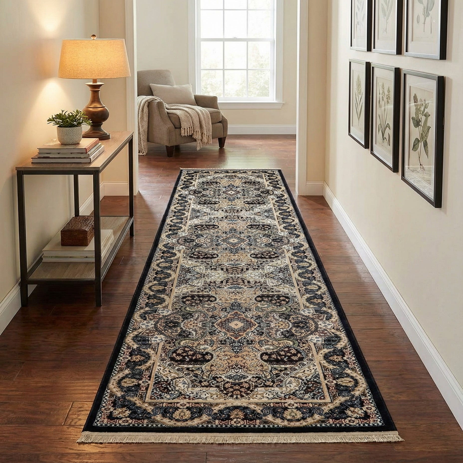 At 85% polypropylene and 15% polyester, the pile has a low, dense hand with a slightly soft, smooth surface and a mild sheen from the polyester fibers. It sits flat underfoot and holds the pattern definition crisply, making it well suited for hallways, entryways, and other narrow circulation spaces. Pair it with warm wood tones or dark painted trim for a traditional setting, use it to ground a transitional foyer with neutral upholstery and brass accents, or layer it in a dining hall or study that blends classic and contemporary pieces.